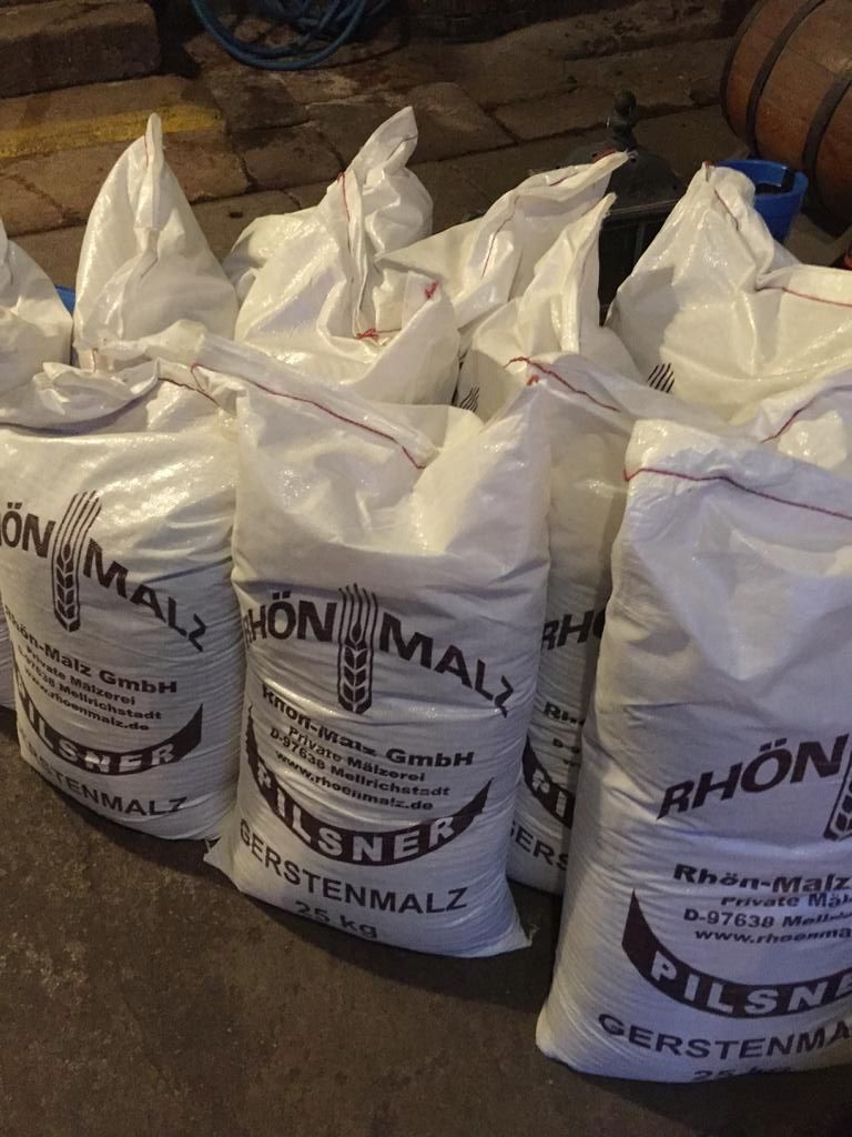 Es waren 11 Sack (275 kg) Pilsner, 2 Sack (50 kg) Münchner, ca. 10 kg "Karamelmalz dunkel" und knapp 9 kg Farbmalz. Zum Karamalz und Farbmalz kann ich nichts sagen, die waren in anderen Eimern verpackt. Das Farbmalz sah aus wie Carafa2, war aber wahrscheinlich nicht von Weyermann.