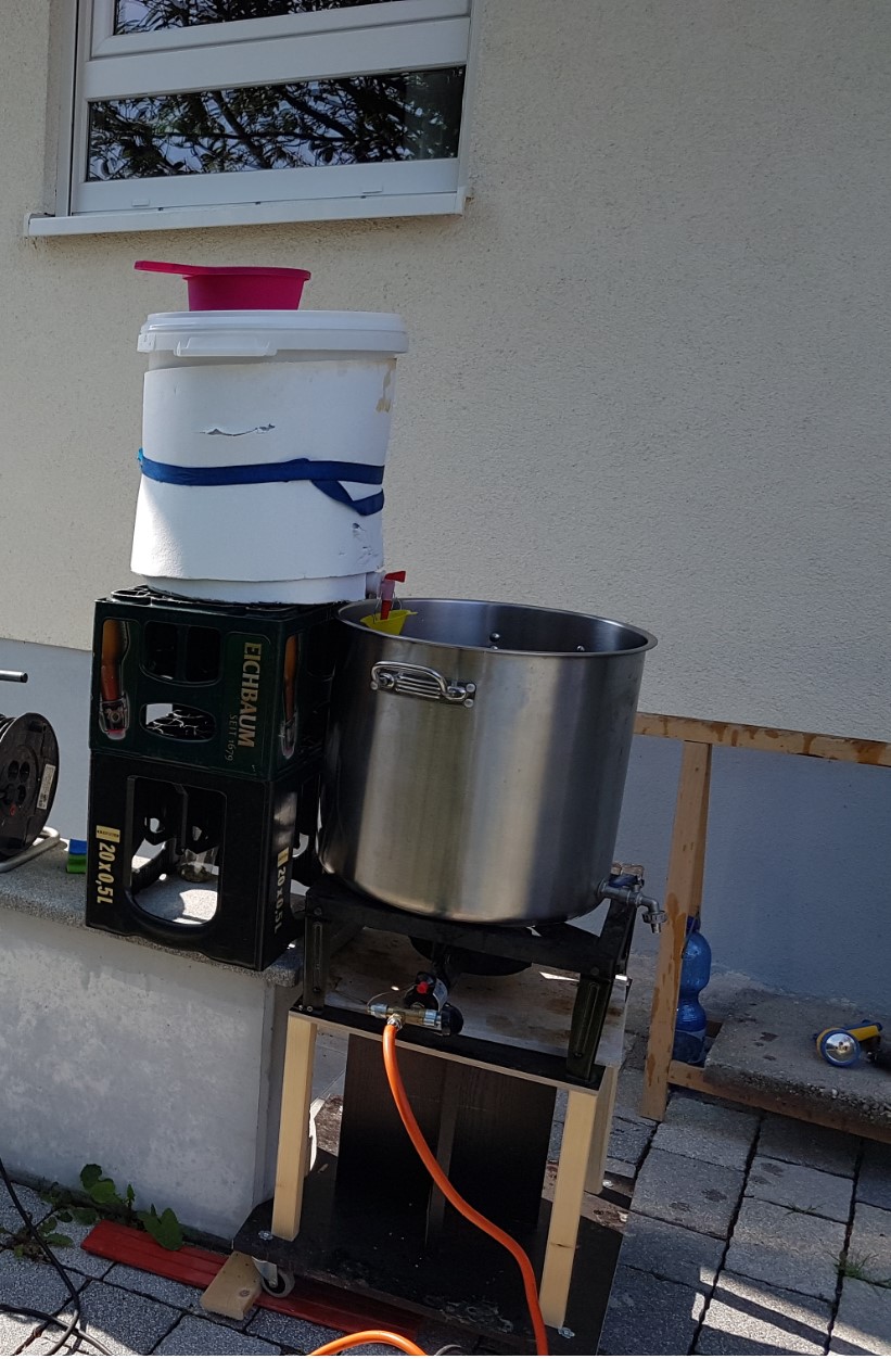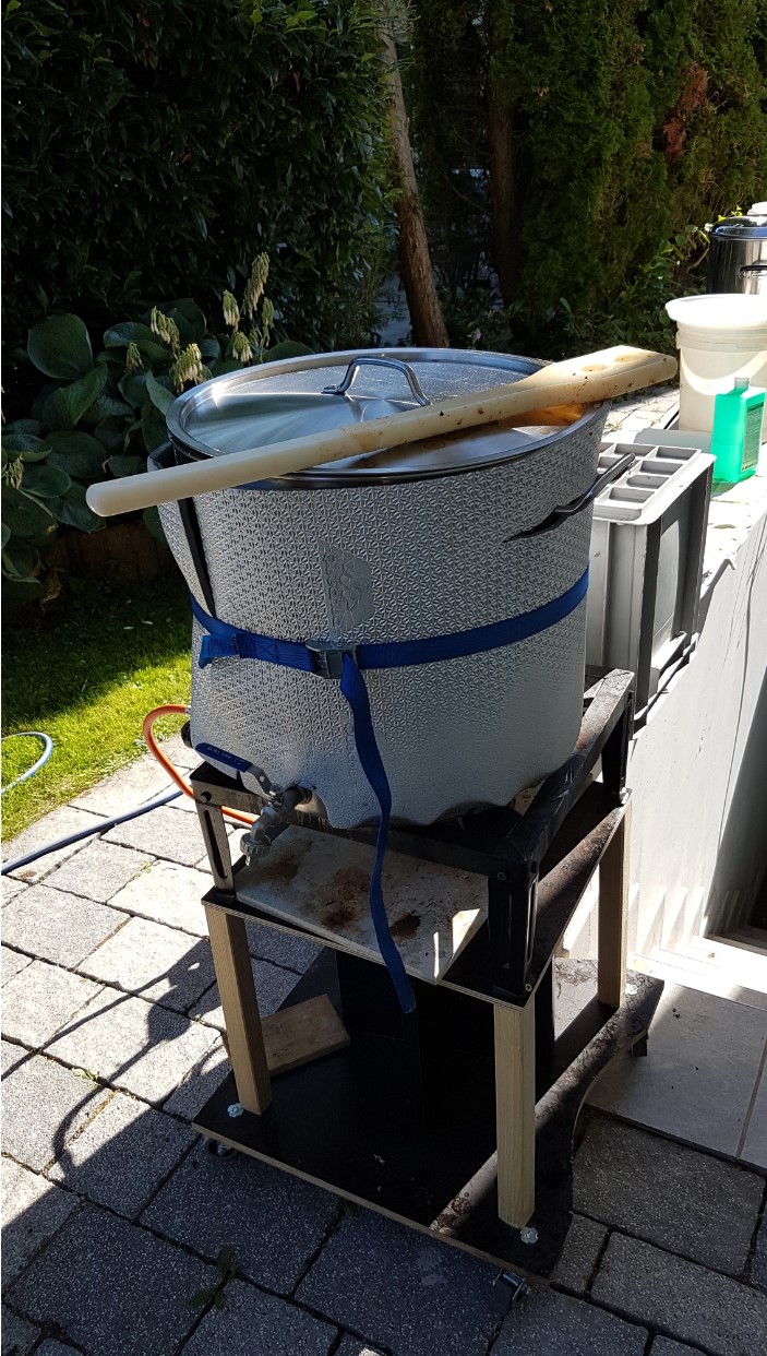 Im freien Braue ich mit einem 7,5 KW Gaskocher, Nachgusswasser wird mit einem Royal Catering 30l Wasserkocher gemacht. Mit dem ich sehr zufrieden bin.