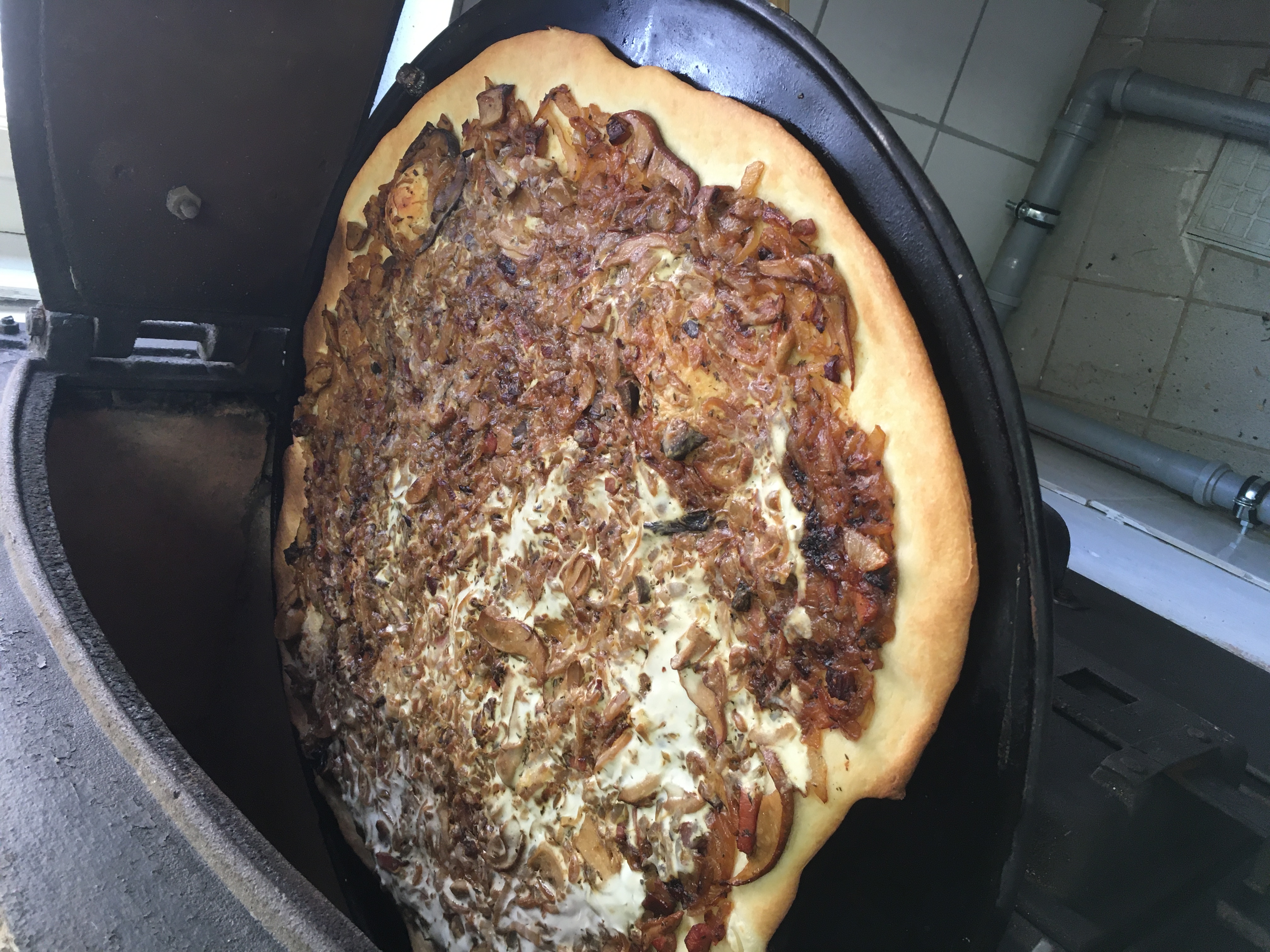 Wenn der Ofen schon warm ist, kann man auch einen Zwiebelkuchen (mit frischen Steinpilzen) reinschieben...