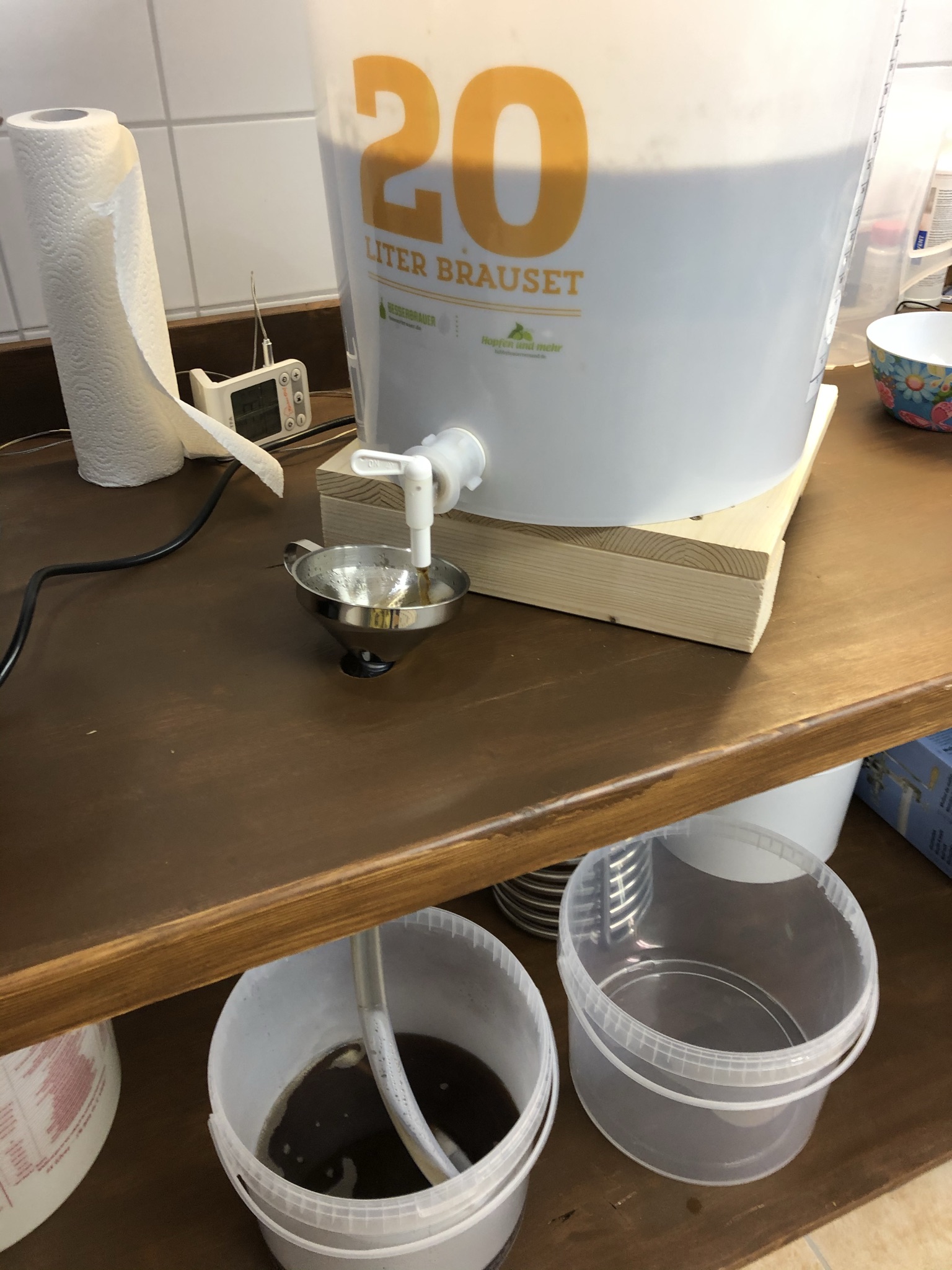 Nach dem kochen wurde gekühlt und dafür hatte ich mir diesmal extra neue Schläuche gekauft so dass ich mit dem Wasserhahn und dem Waschbecken aus der Waschküche (zwei Räume weiter) die Würze runter kühlen konnte und das hat echt hervorragend geklappt, so gut sogar, dass ich am Ende nicht schnell genug war und die Würze bereits bei 17,5 Grad C. angekommen war. Aber da ich eh vermutet hatte, dass ich wieder etwas Wasser nachmischen muss, um auf die 13° P. zu kommen, habe ich das einfach mit heißem Leitungswasser gemacht (ich hoffe, das war ok so).