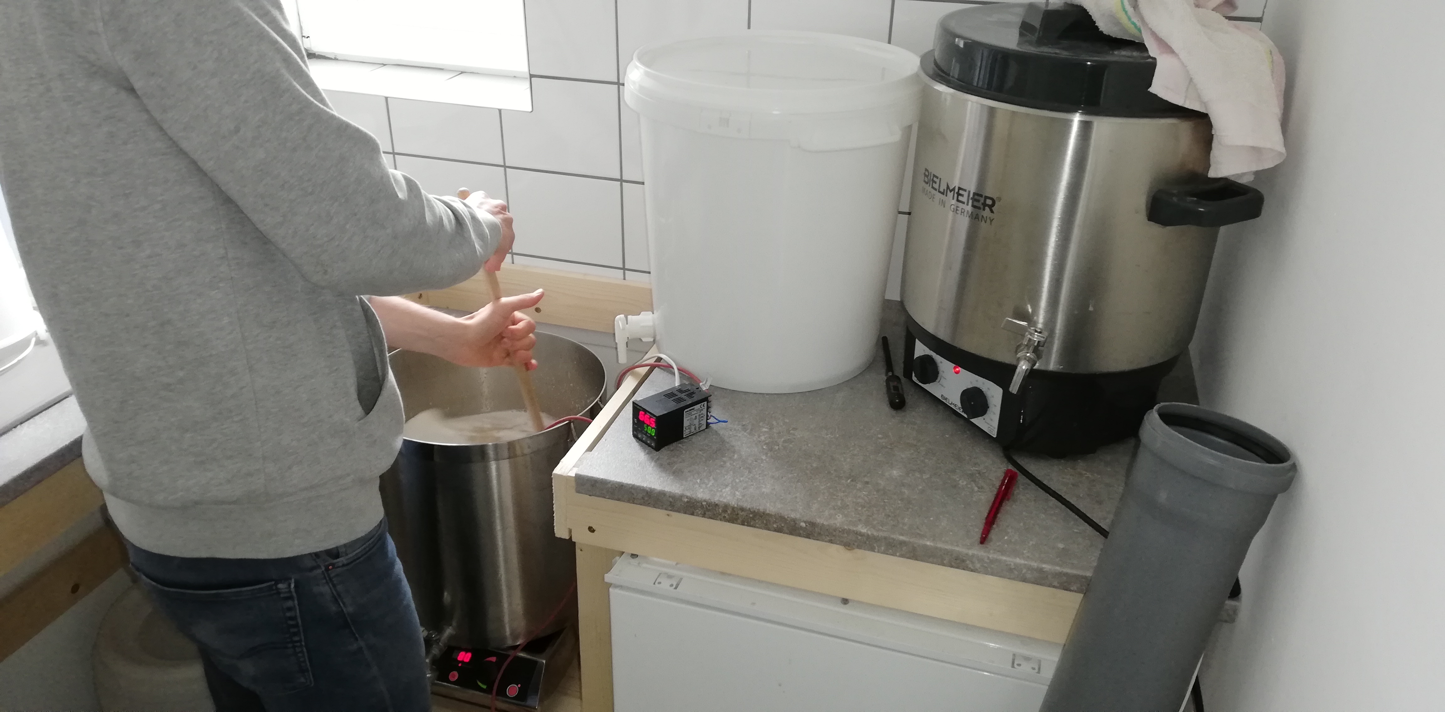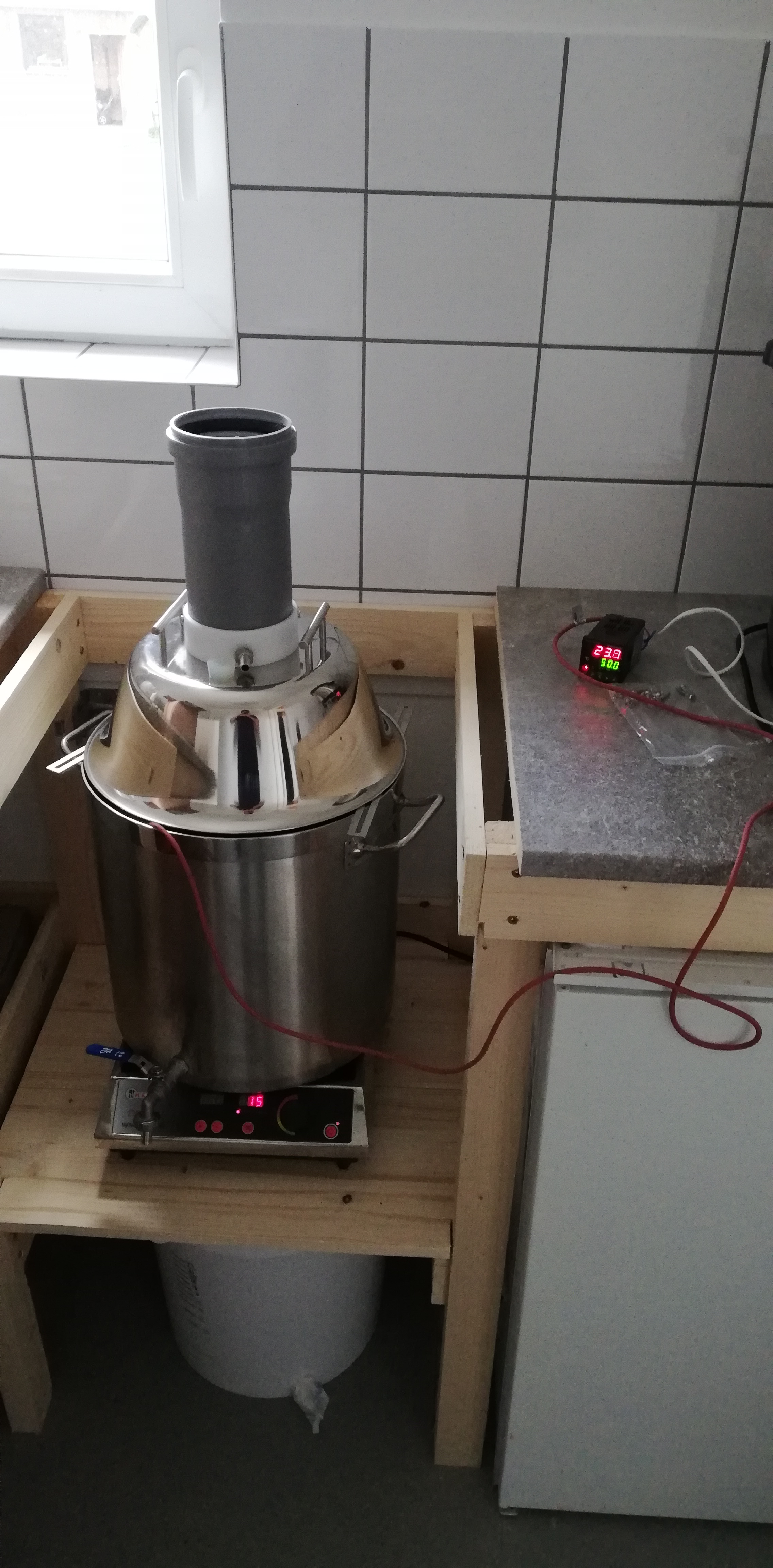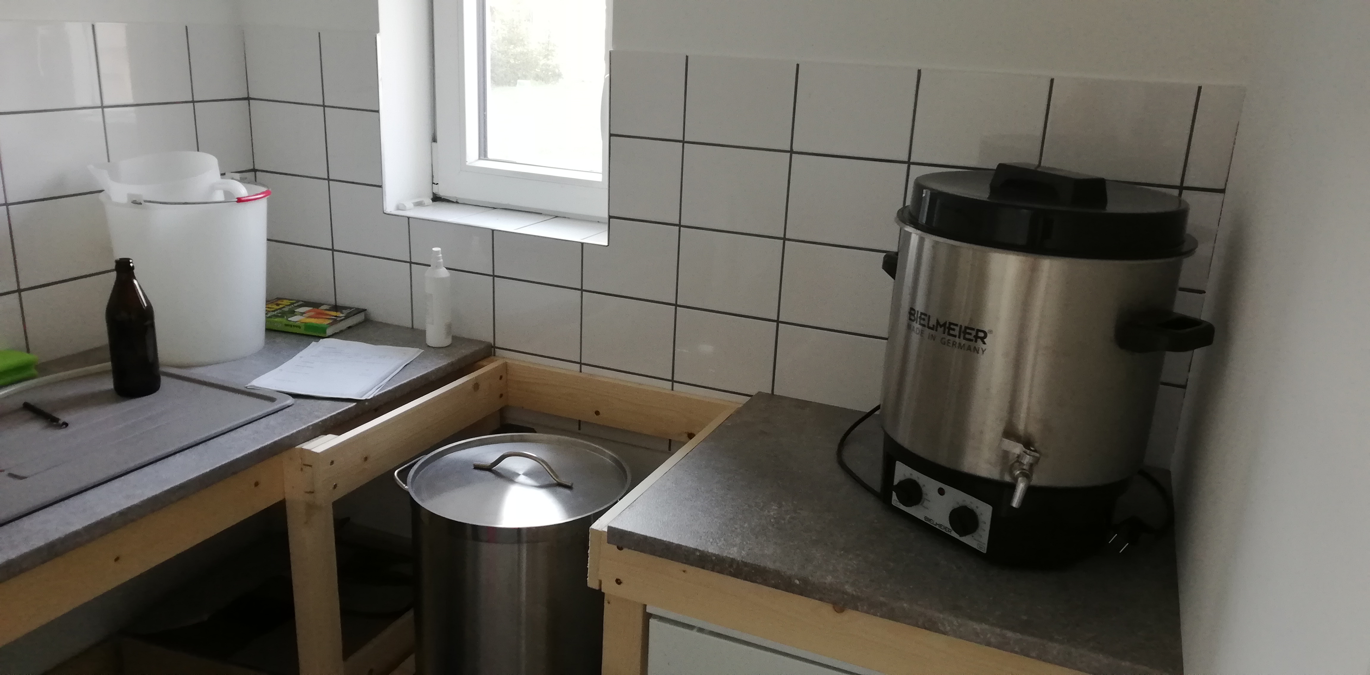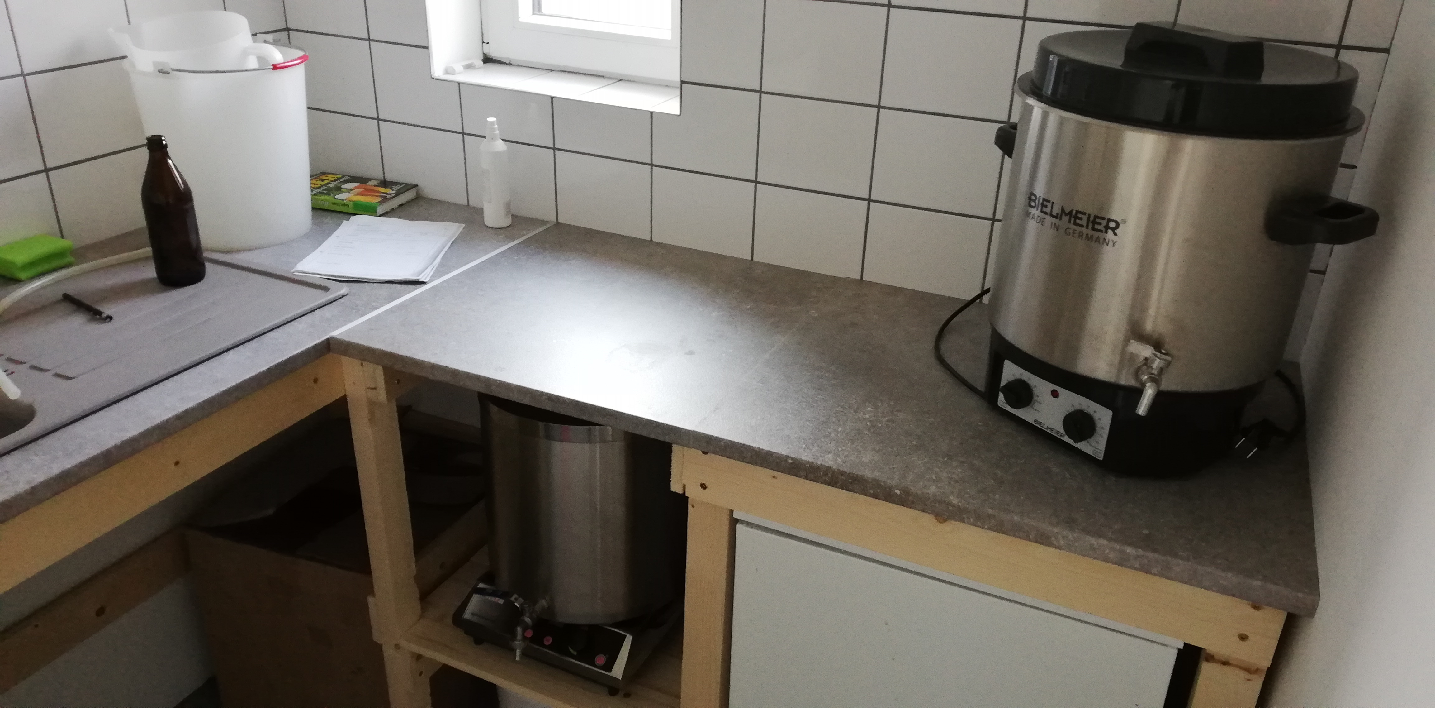 Danach habe ich in unserem zwischenzeitlich gekauften Haus einen kleinen Nebenraum gefliest, Spüle und Kühlschrank eingebaut und auch schon gebraut. Die Arbeitsplatte über dem Topf kann man wahlweise rausnehmen (zum Brauen) oder einlegen (Abfüllen, Reinigen)