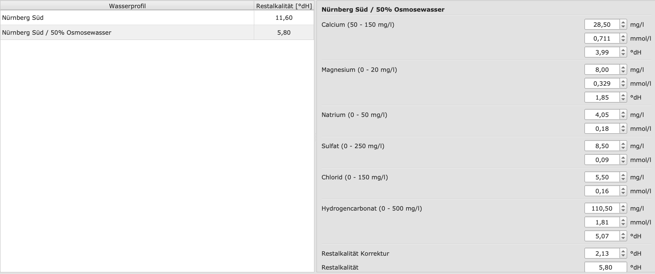Wenn ich die Daten in mmm oder dem kbh eingebe, komme ich auf eine RA von 7,4°dH. Laut Wasserversorger sind es aber 11,6°dH. Die Differenz gebe ich nun im kbh rechts unten ein: