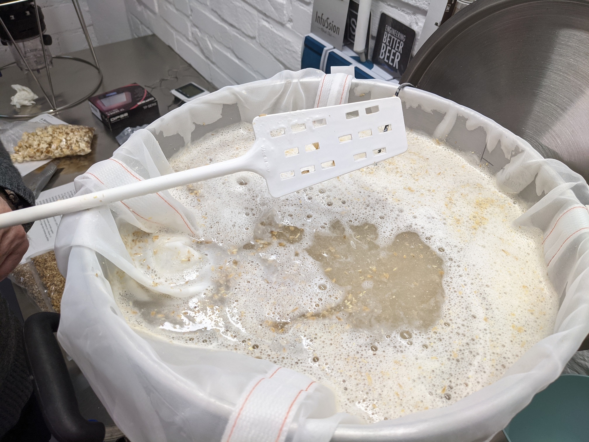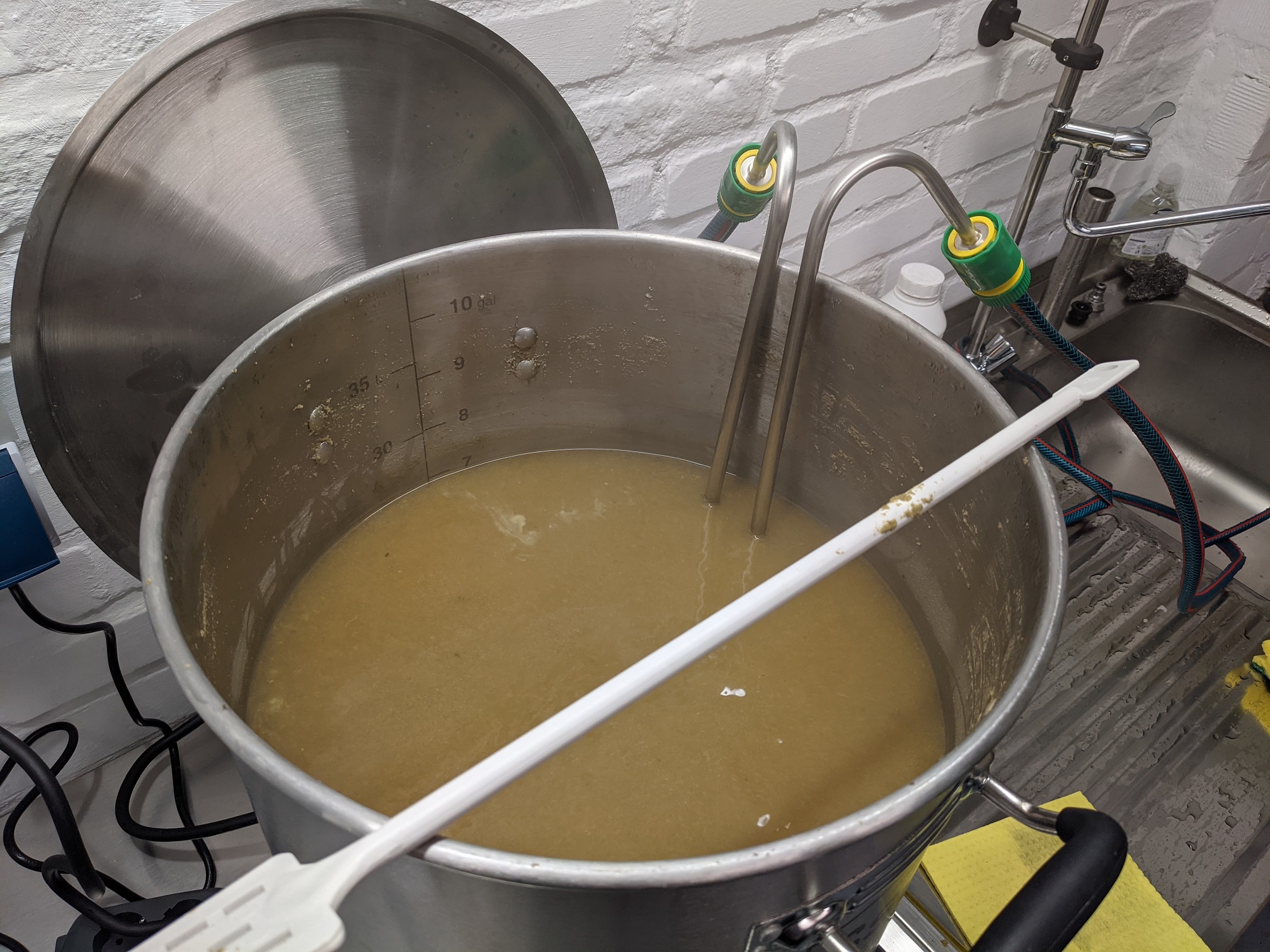 ...also konnte früher abgemaischt werden als geplant. Sehr gut. Hiervon habe ich leider kein Bild, da ich mit dem heißen Sack beide Hände voll zu tun hatte. Das ging zwar viel besser als geplant, aber da ich die Möglichkeit habe, wird dennoch als nächstes wohl ein Flaschenzug installiert. Warum nicht.