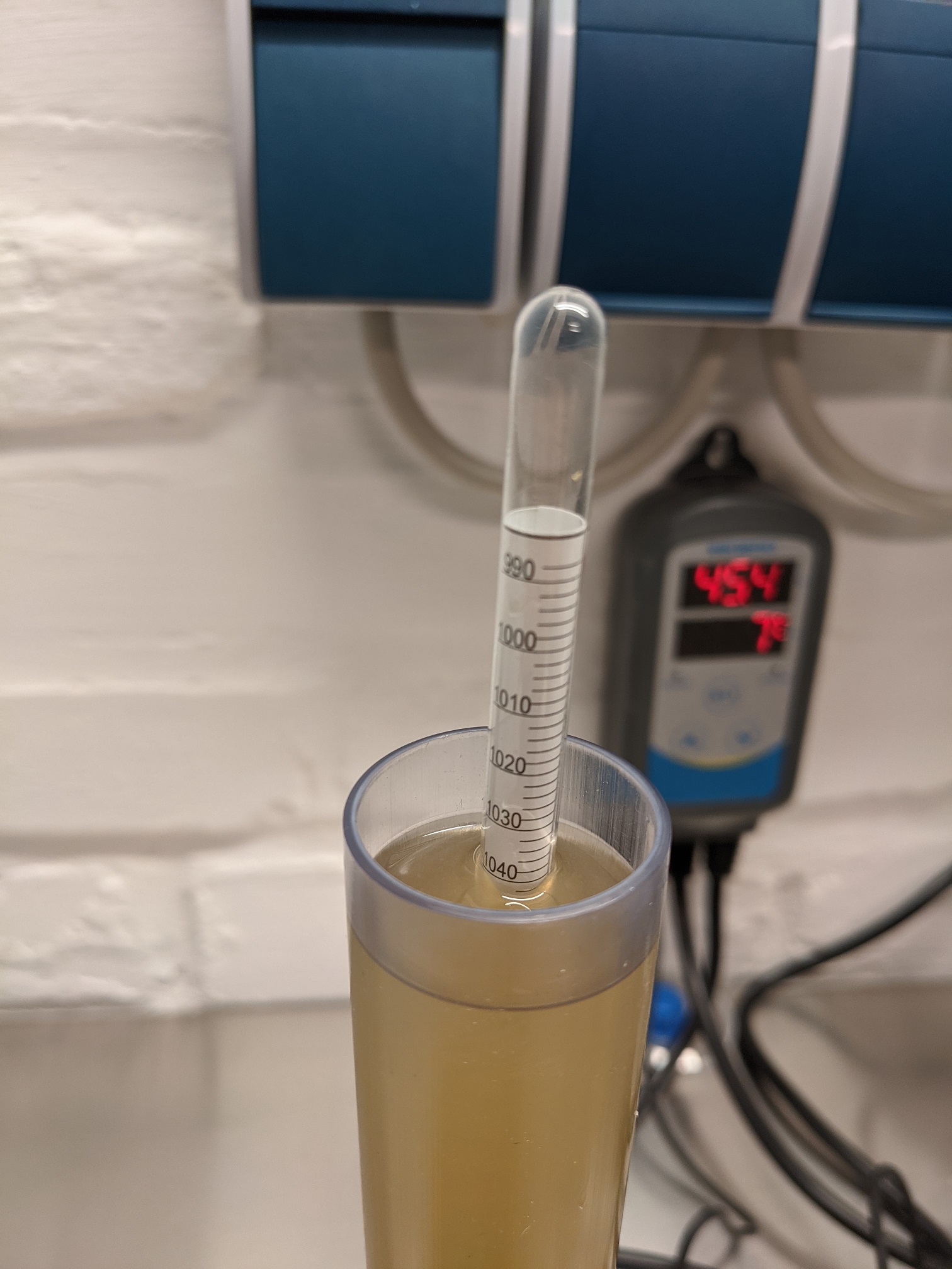 Die Postboil-gravity habe ich gemessen und erwartungsgemäß ebenfalls übertroffen. Geplant war eine SG von 1.047 (etwas unter 12° Plato), getroffen habe ich 1.050 (12,5°P).