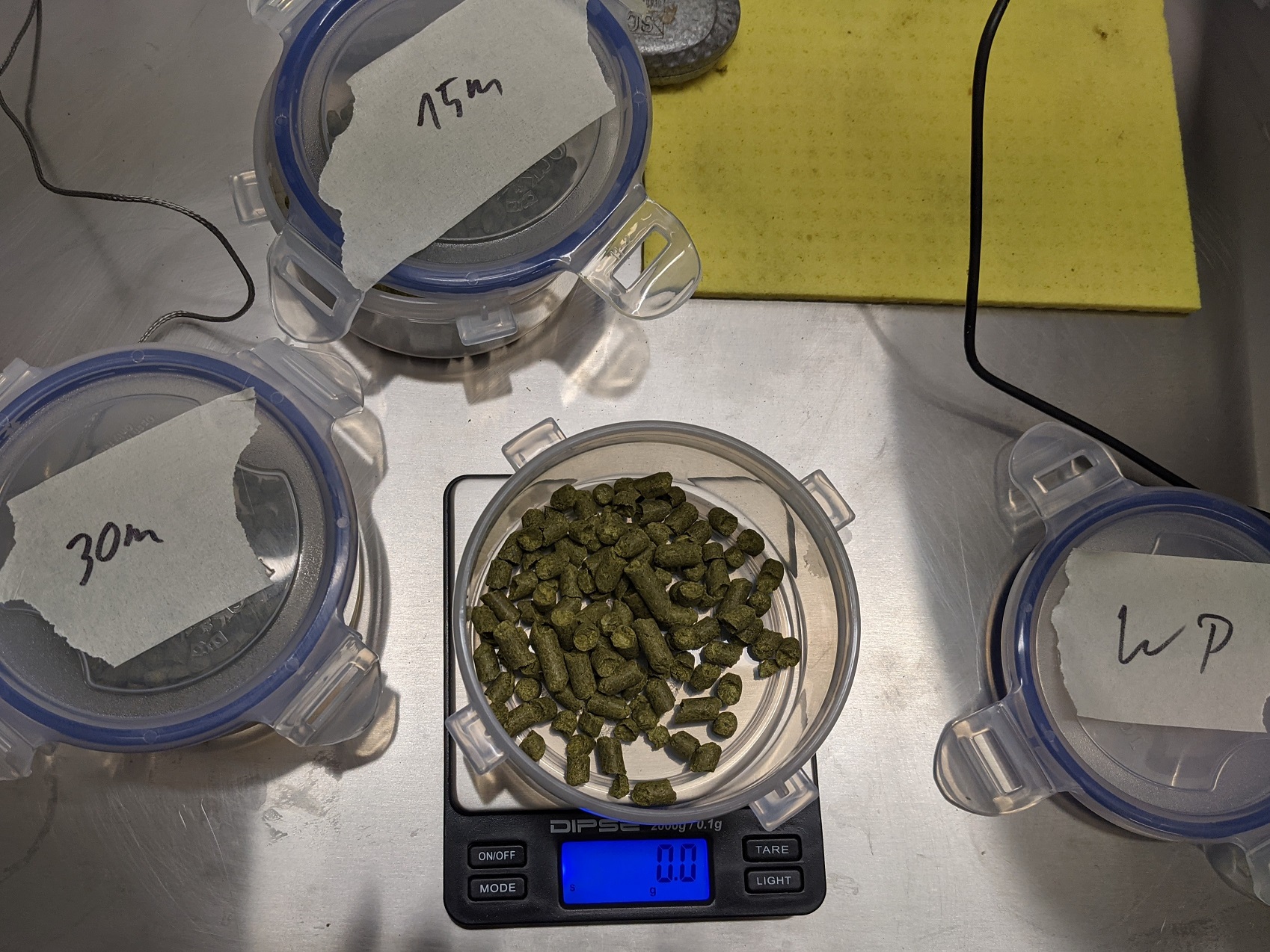 Den Vorderwürzehopfen habe ich nach dem Abmaischen zugegeben und dann aufgeheizt. Währenddessen die weiteren Hopfengaben abgemessen.