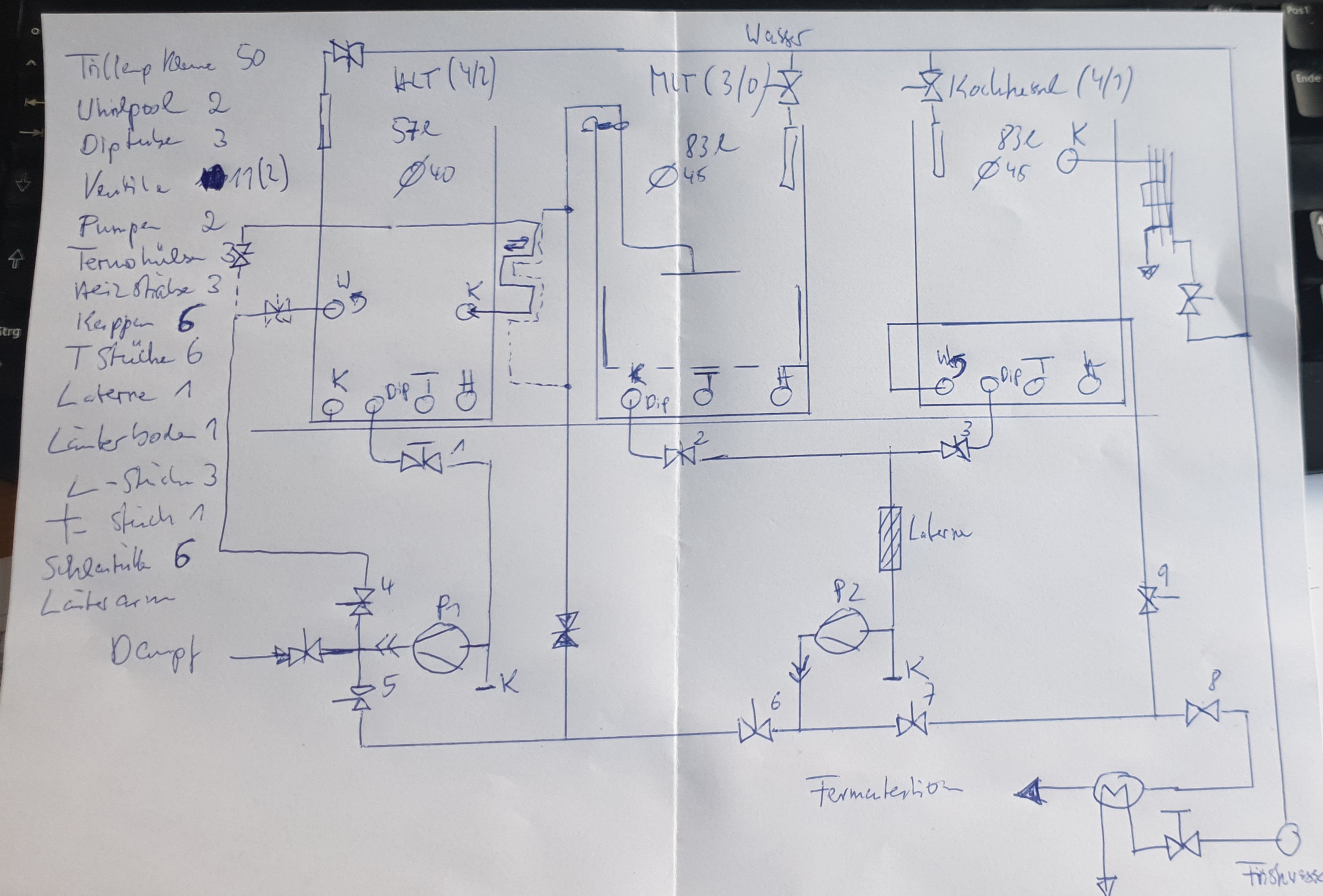 Am Anfang war die Idee und ein grober Plan... die Anlage sollte ca 75 Auschlagmenge haben, ein Drei-Kessel Sudhaus werden CIP-fähig sein, einen Würzekühler, Dämpfer und Malzmühle enthalten... und dann gings los ;-)
