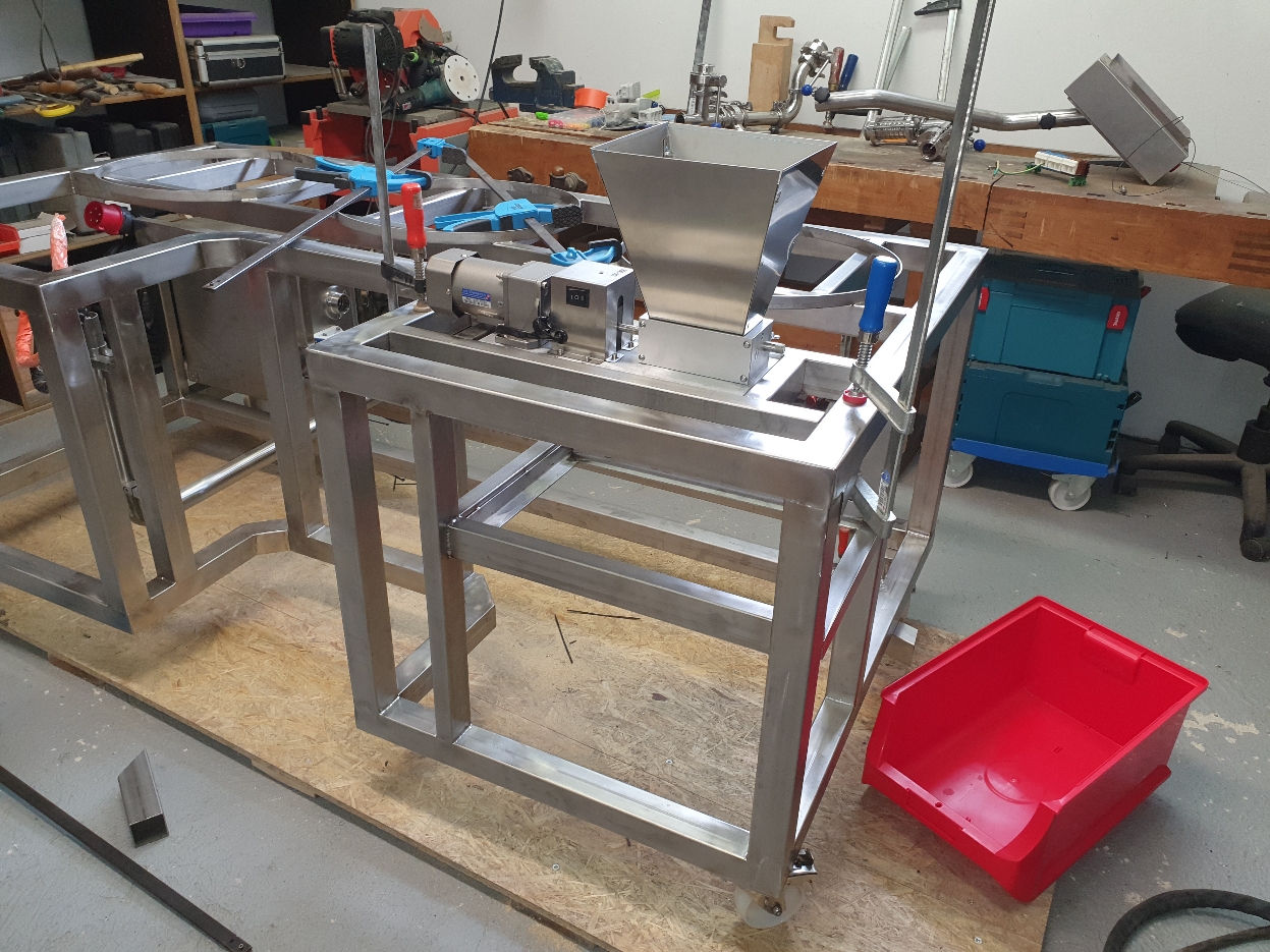 und ja.... es ist die erste Anlage gewesen :-))) ... und tatsächlich gäbe es sogar noch die eine oder andere mögliche Ausbaustufe... z.B. könnte die Anlage auf ein HERMS-System umgerüstet werden. Was die Malzmühle angeht so teile ich die Bedenken was den Staub angeht nicht wirklich... das Schroten passiert ja ganz am Anfang... und ab dem Maischen gibt es ja quasi keinerlei Kontakt mehr mit dem Staub... tatächlich ist aber die Mühle ein Schwachpunkt der Anlage. Es handelt sich dabei ebenfalls um ein Chinamodel was den Rollen her O.K. ist aber der Motor dreht wirklich sehr langsam. Das Schroten dauert gefühlt eine Ewigkeit und man muss es definitv parallel zum CIP-Reinigen vor dem Brauvorgang machen... :-) sonst dauert es...