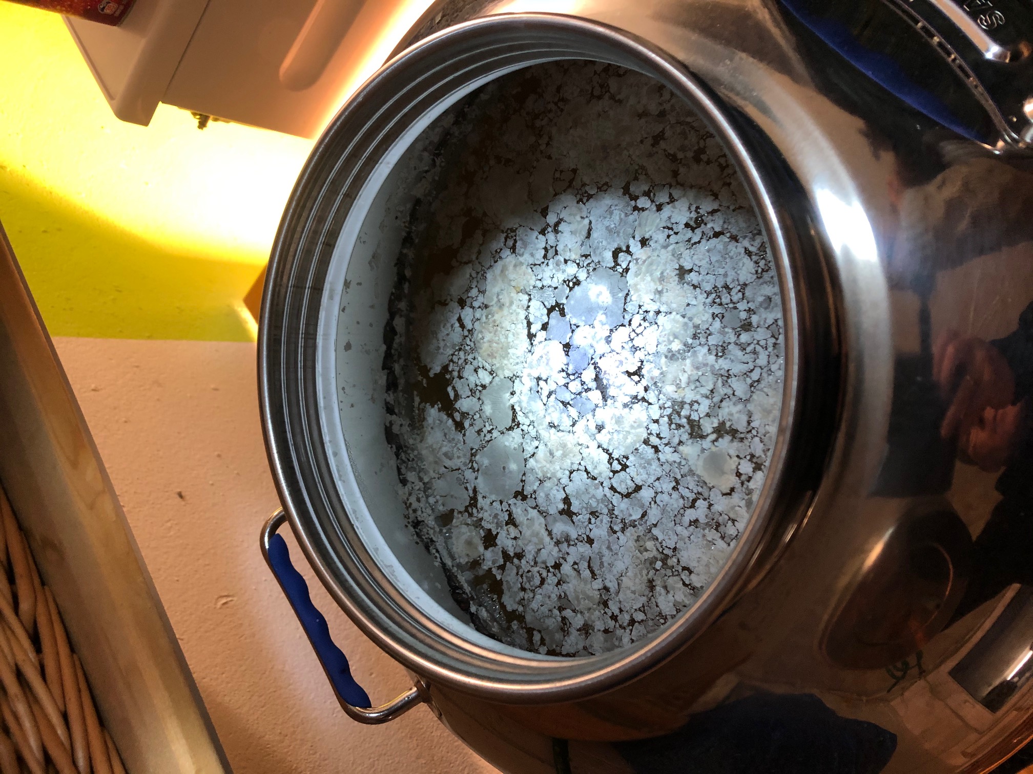 wir haben am Wochenende unsere Berliner Weiße, gebraut am 5. Dezember, abgefüllt. Das ist die eine Gärkanne mit der puren Weiße, die andere mit später zugesetzten Kirschen darf noch etwas arbeiten, 2 x 30 Liter Inhalt à 9 % Stammwürze.