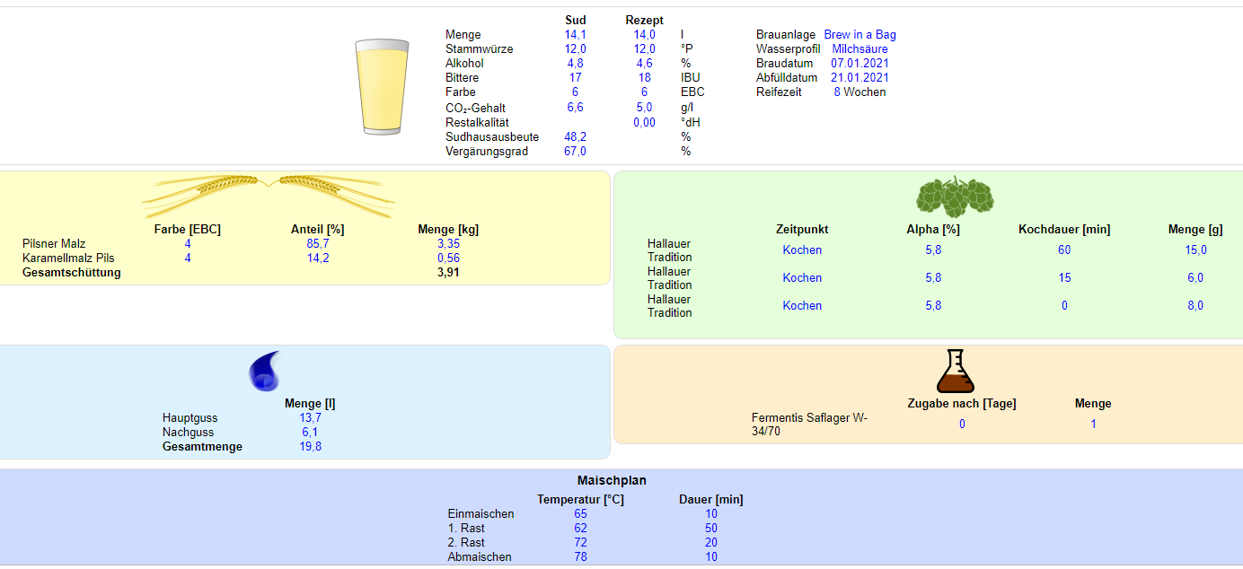 Nach vielen suchen habe ich mich an einem Hellen als Basis orientiert. Ich habe dann knapp 10% der Würze aus dem Brauvorgang aufgefangen und eingefroren. Nach der HG habe ich die dann (aufgetaut) mit den extra 6g W34/70 in das NC-Keg gegeben und das vergorene Bier draufgeschlaucht.