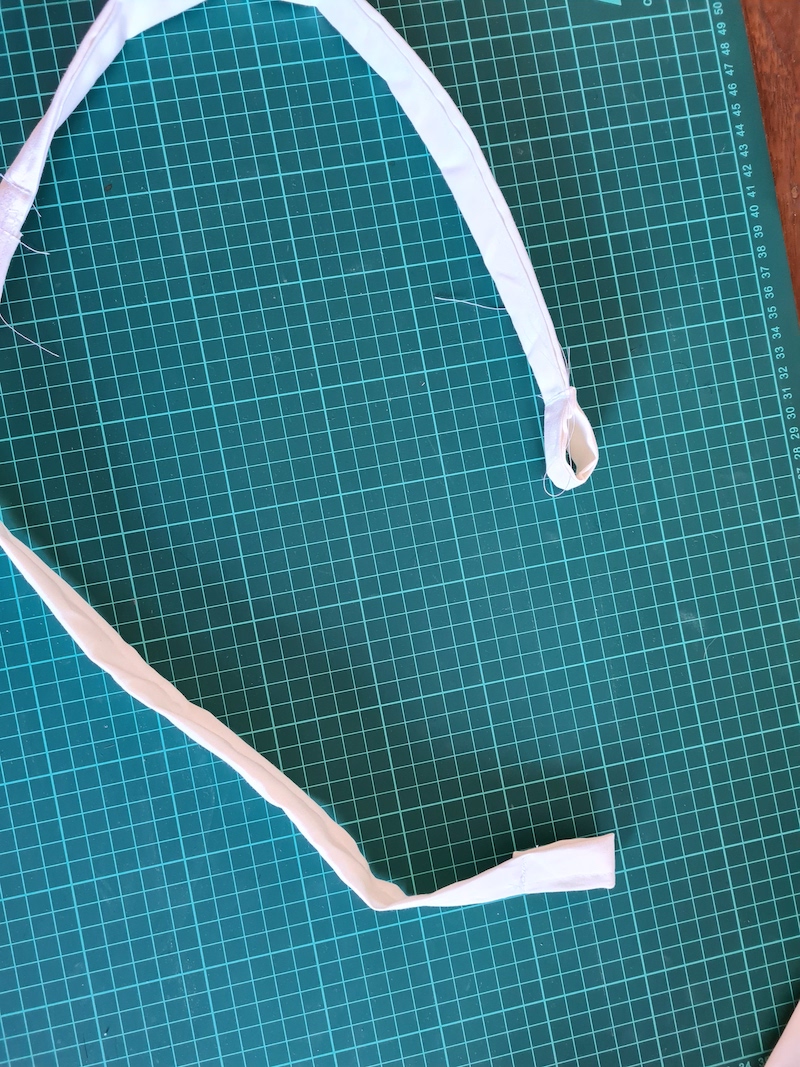 Dann gab's die zwei Gardinen-basierten Seitenstücke, die jeweils von Baumwoll-Seiten-Griff zum Baumwoll-Seiten-Griff gehen und entsprechend an den beiden Griffen angenäht wurden.