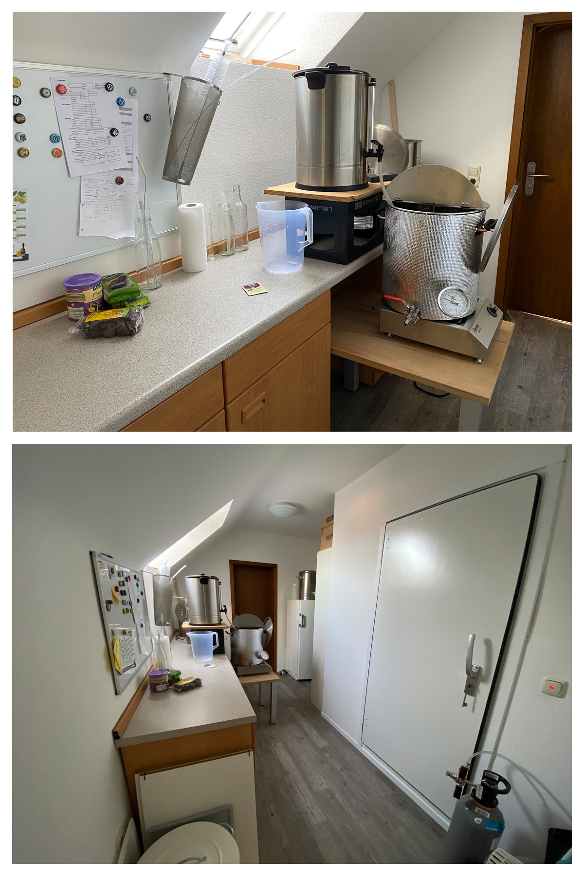 Los ging es mit dem Schroten auf dem Balkon. Staub kann draußen bleiben. Die Schüttung sah schon mal hübsch aus. Die Braukemenate war auch aufgeklart und alles vorbereitet (die Bilder sind größer als hier dargestellt - draufklicken hilft).