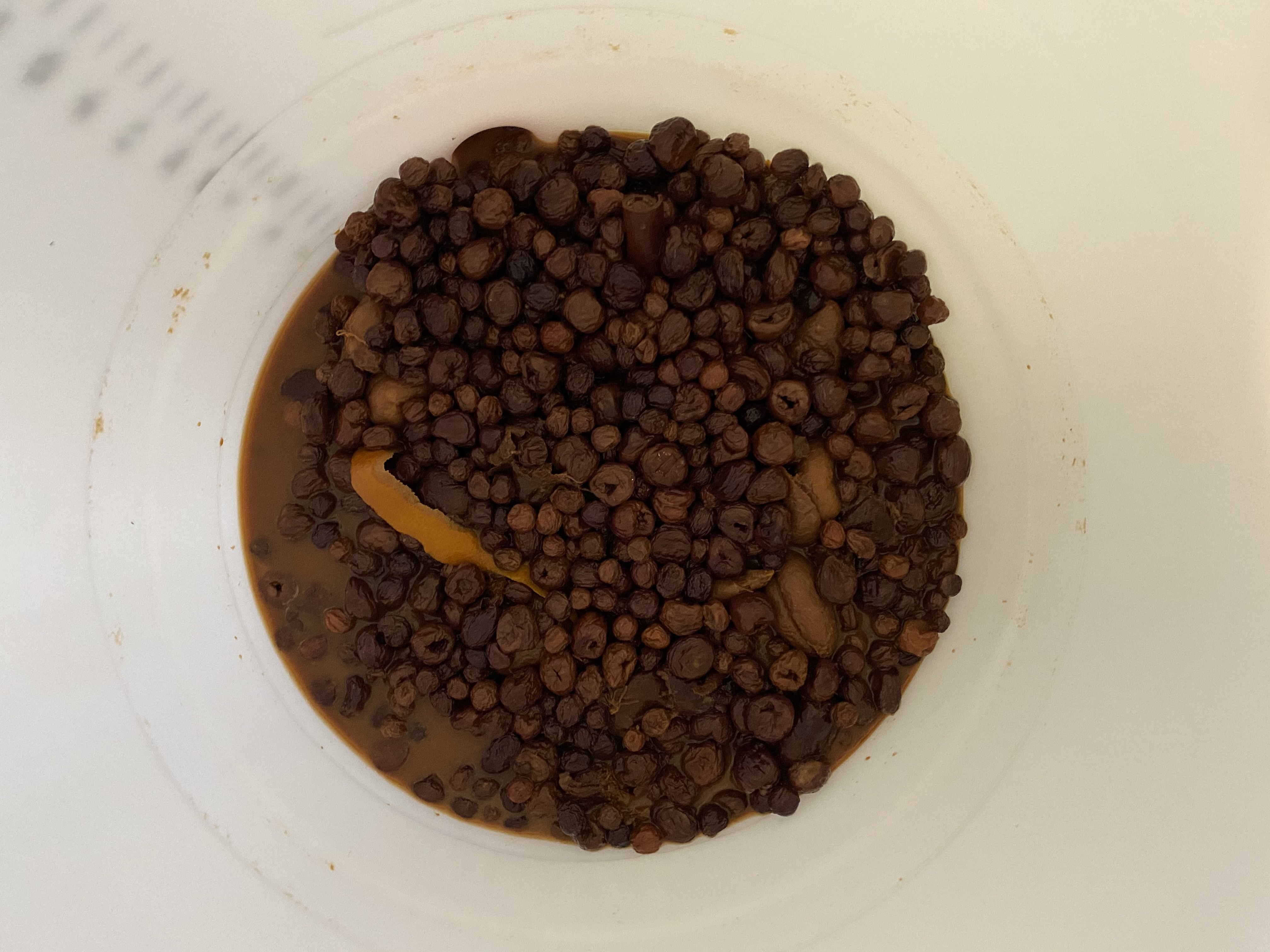 whatever, plus the zest of two oranges and two whole cloves. Pour boiling water over it to rehydrate;