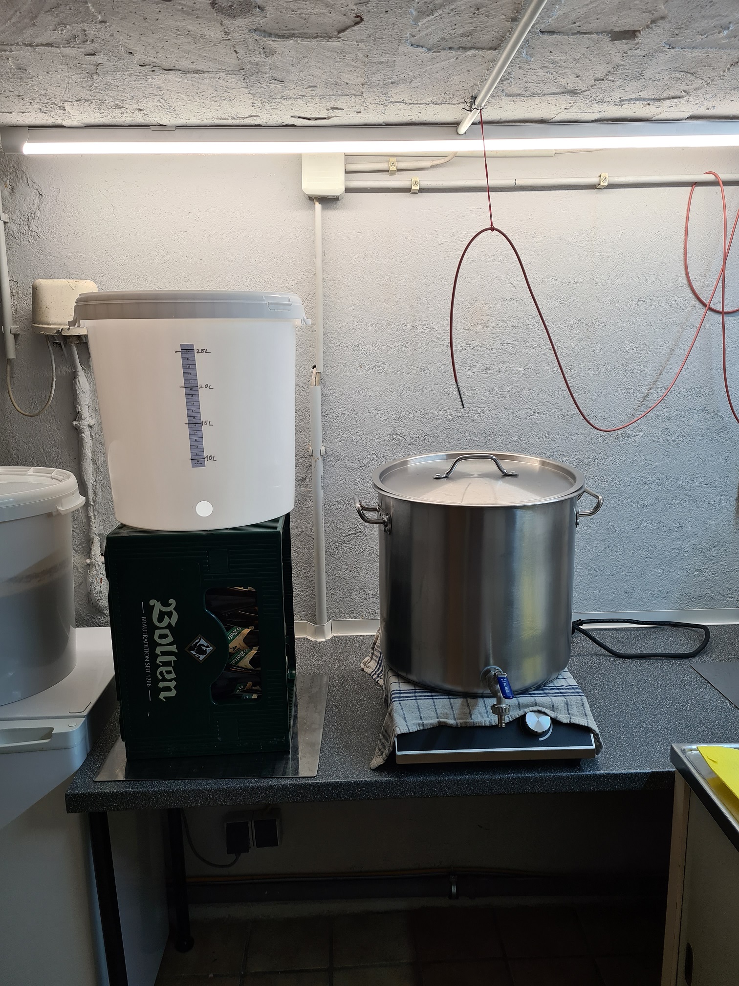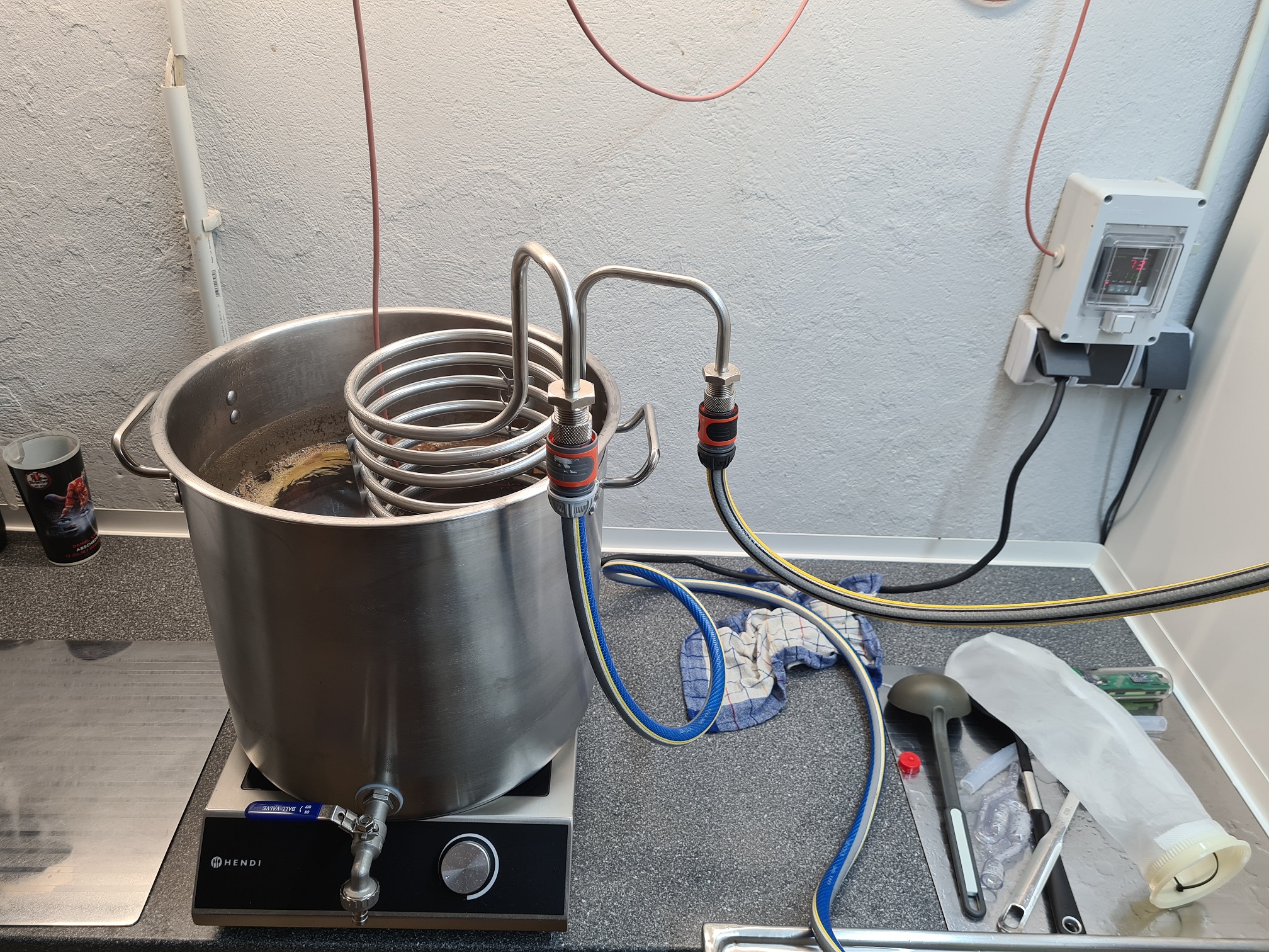 Braufex hat geschrieben: Sonntag 13. Juni 2021, 18:59 Meine 36l-Pfanne steht auf der Induktionsplatte auf dem Tisch, der 25l-Thermobehälter steht daneben zusätzlich auf 2 Bierkästen. Die Maische wird beim Abmaischen aus der Pfanne in den Thermobehälter umgeschöpft.