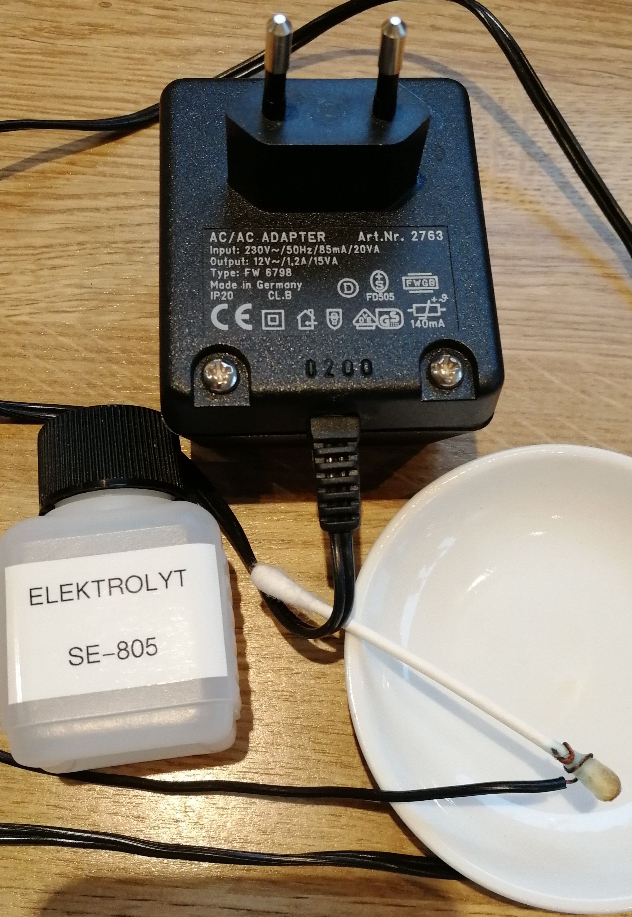 Als Signierkit diente ein 12V Wechselstromnetzteil mit 1,2 A von einem alten Modem, einige Q-Tips und ein paar ml Dimatron Elektrolyt. Ich bin vom Ergebnis ganz angetan. Durch das Dimatron Elektrolyt sind die signierten Flächen schön schwarz geworden, nicht so braun wie mit Salz oder Essig angemischem.