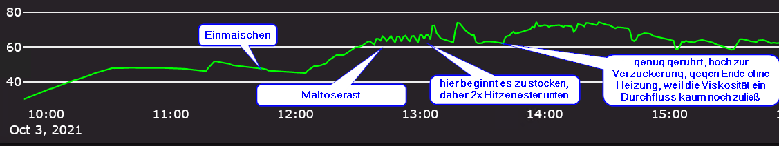 In den niedrigen Temperaturregionen (45-63°C) heize ich relativ langsam hoch (0,3K je Minute), damit im Topf nicht soviel Stärke anbrennt.