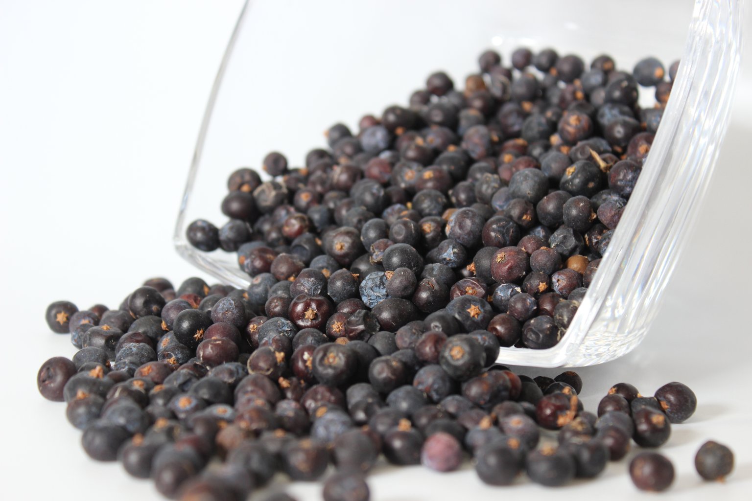 Die ersten 113g Wacholderbeeren für die Maische. Vor dem Einmaischen habe ich sie im Mörser zerstoßen.