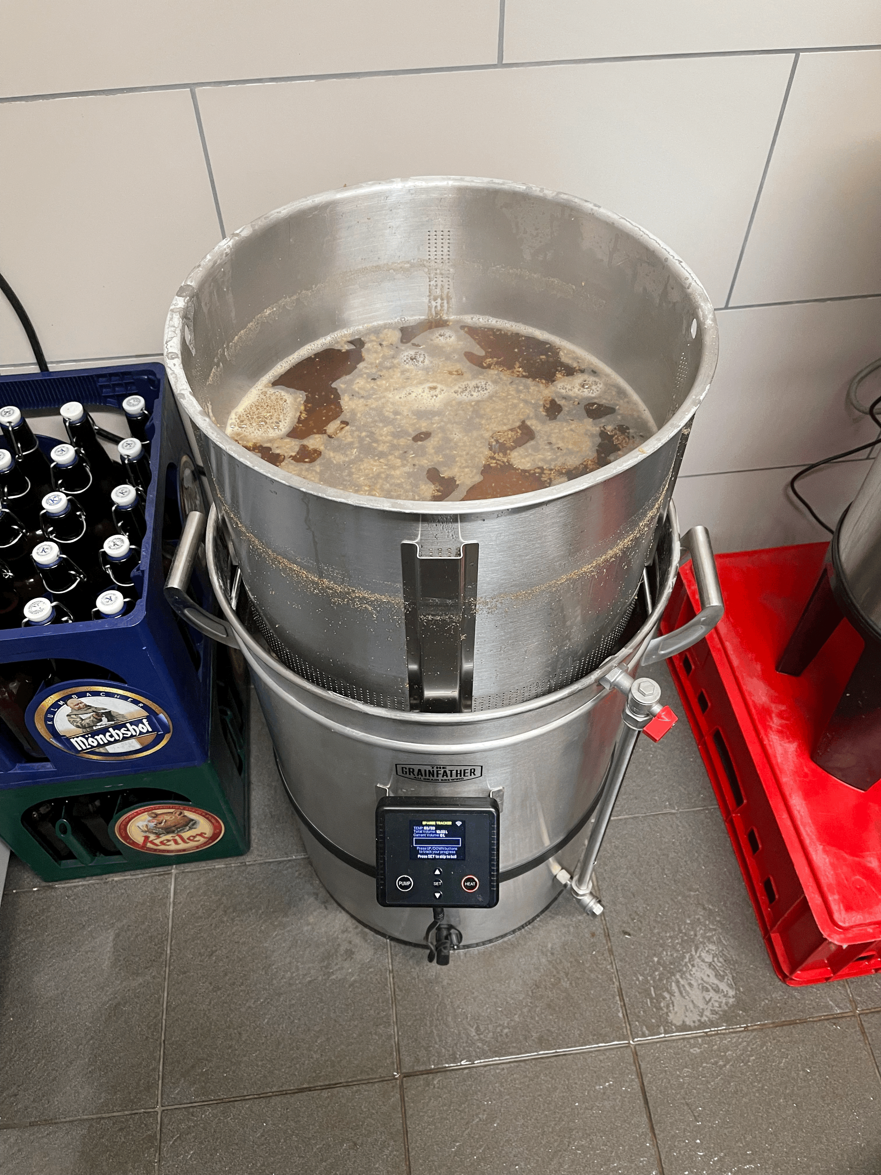 Kleine Anmerkung: beim ersten Sud hatte ich nicht gerührt (außer beim Einmaischen) und hatte den Hahn am Malzrohr ganz geöffnet. Daraufhin stieg die Würze so hoch, dass sie durch die Löcher für den Läuterbügel übergelaufen ist. Dieses Mal habe ich fleißig alle 5 Minuten kräftig durchgerührt und den Durchlauf am Hahn auf ca. 50% reduziert, was dann auch einen vernünftigen Würzepegel (wie Grainfather empfiehlt, ca. 1 Inch über dem Malz) ergab.