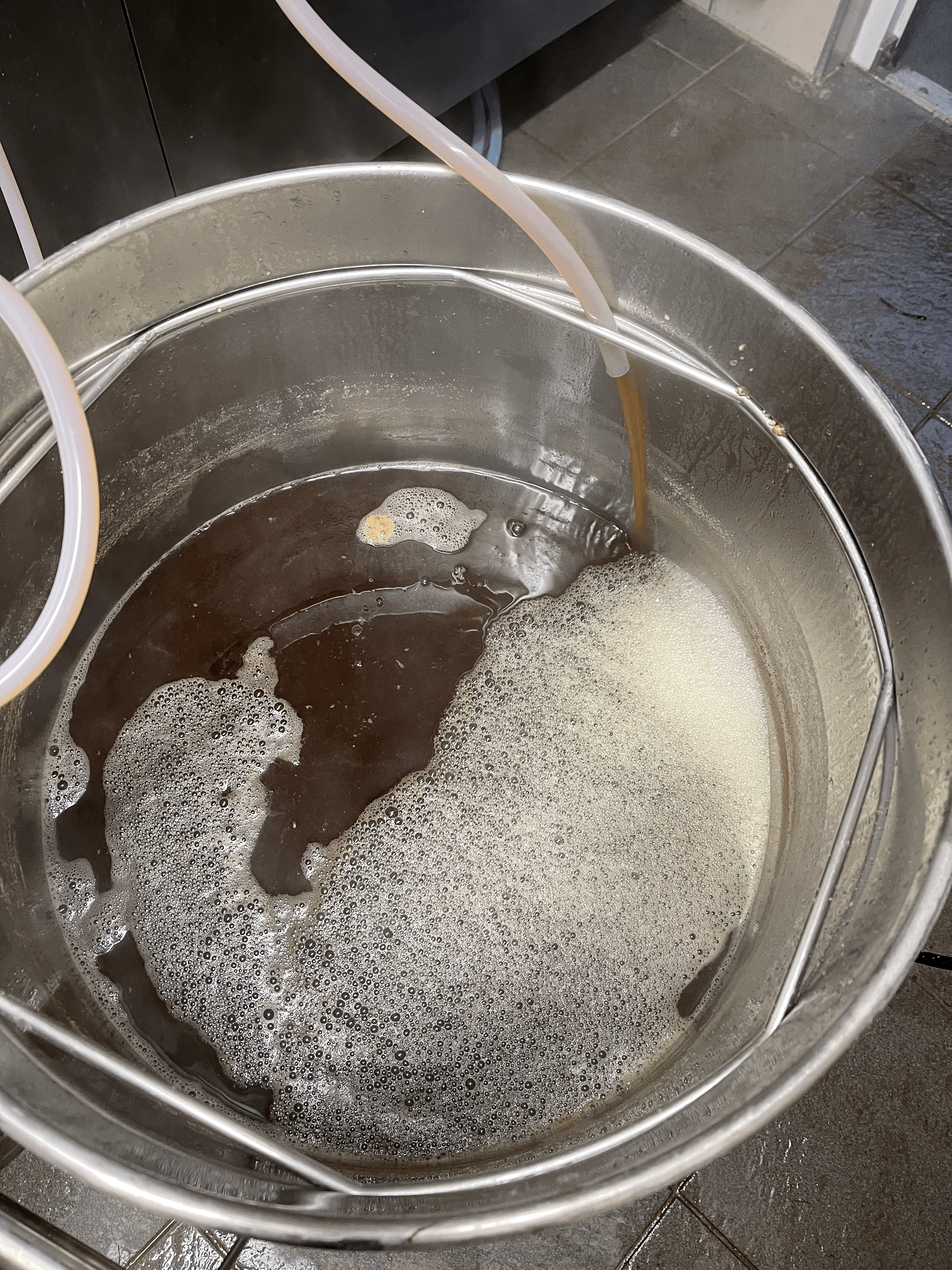Ich hatte beim ersten Mal sehr gute Erfahrungen damit gemacht, in den GF40 zurück zu kühlen. Ich weiß, dass das nicht unbedingt effizient ist, aber als Anfänger möchte ich nicht noch Zwischengefäße benutzen und die Würze so schnell wie möglich anstellen.