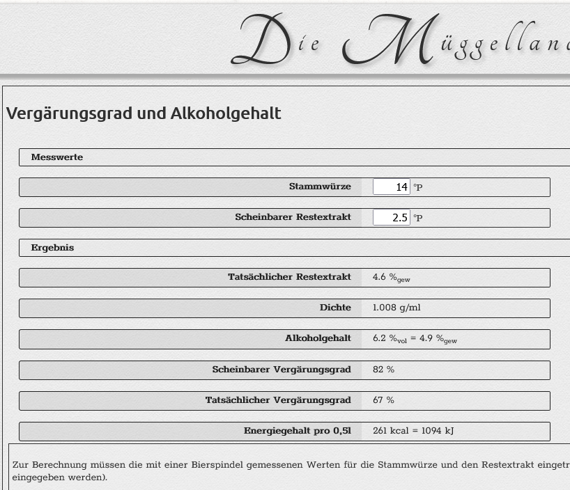 Ich braue Würze mit 14 °P und setze mit der Safale US-05 einen sEVG von 82% voraus. Laut fabier- und Müggelland-Rechner bedeutet das einen scheinbaren Restextrakt von 2,5 °P und einen Alkoholgehalt von ca. 6,2% (siehe anbei).