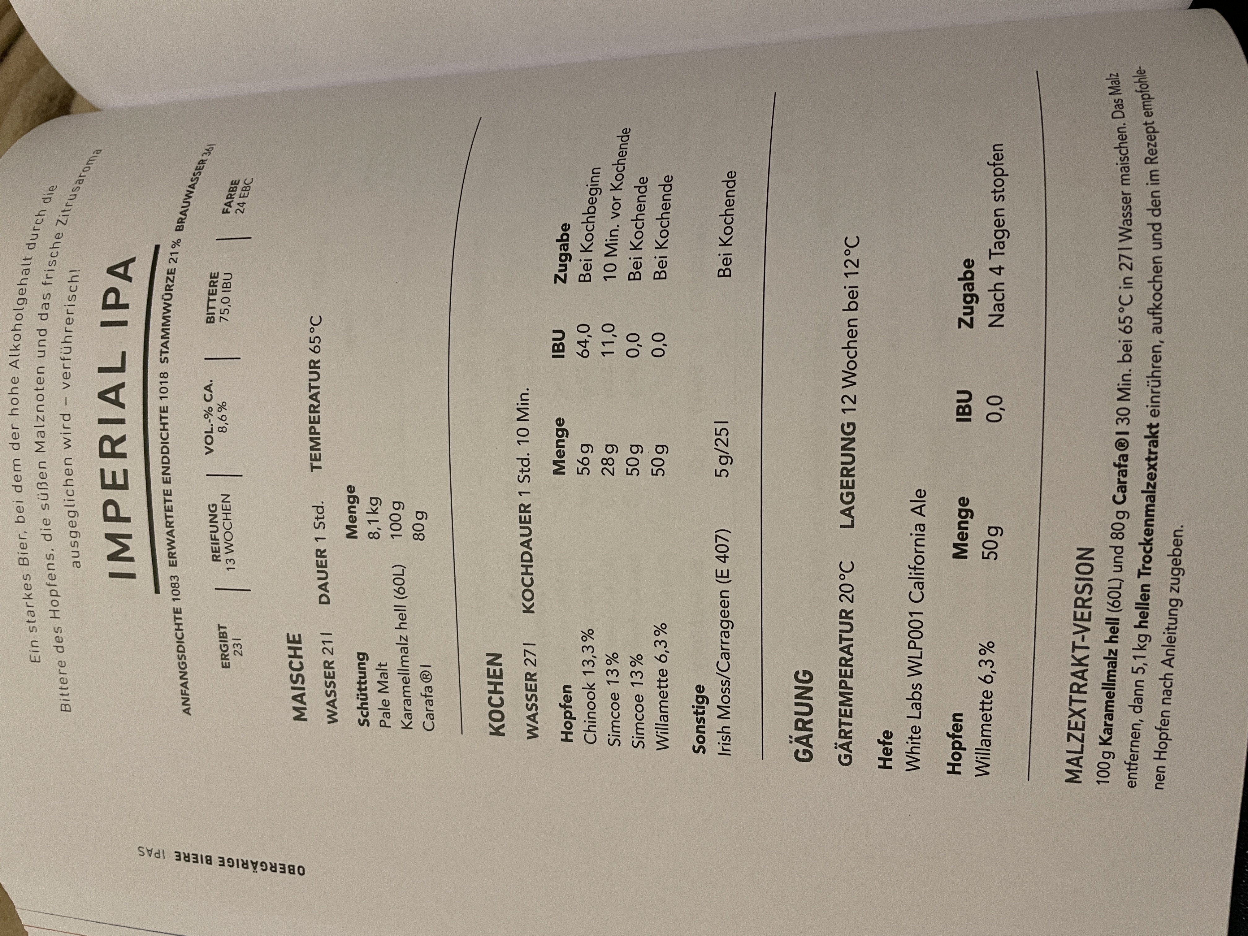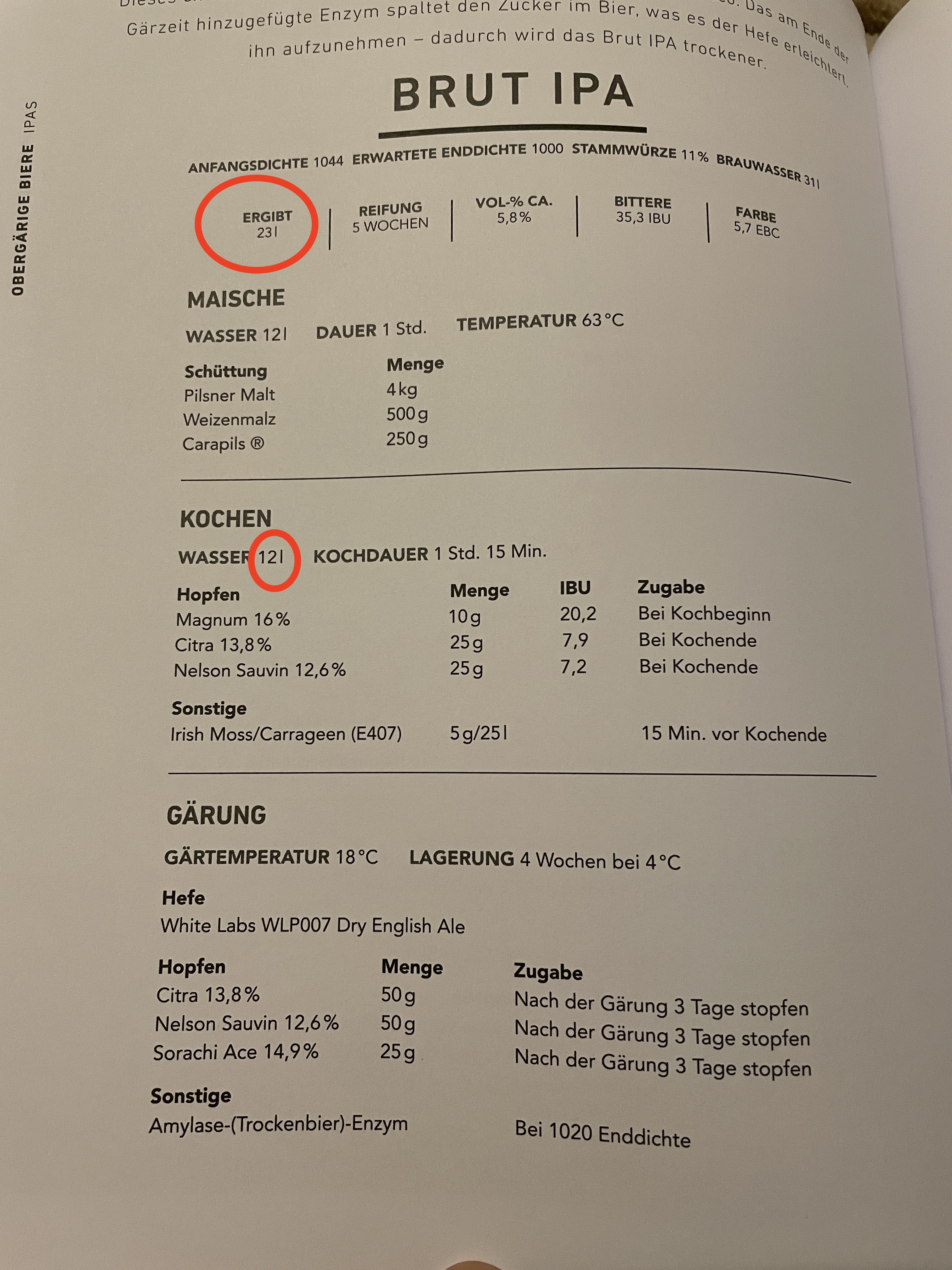 Beim Brut IPA muss irgendwo ein Zahlendreher sein, allein die 12L Hauptguss sind zu wenig und wie man von einem Kochvolumen 12L am Ende bei 23L landen soll???