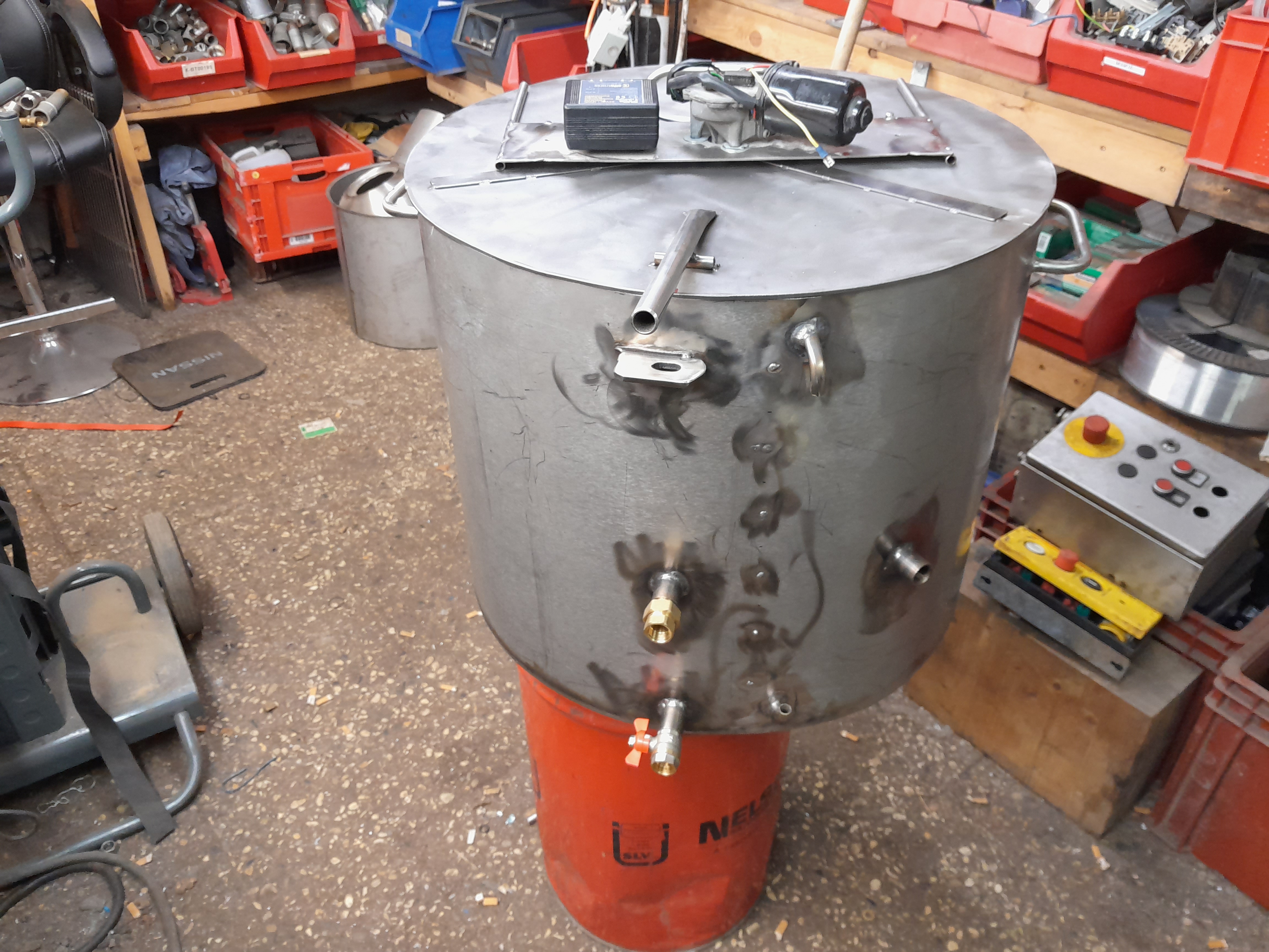 Zur Zeit lass ich mir 2 Behälter aus Edelstahl bauen: Höhe 50cm Durchmesser 63cm. Schweißen mit WIG kann ich selber. Ich lasse nur die Außenhülle rollen und die Böden und die Deckel lasern. Der Gärtopf wird ein Kunststoff-Fass werden.