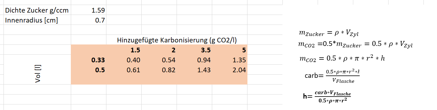 Bei einer Abfülltemperatur von 20° sind dies etwa 1.65 g/l. Verwendet man bei einer Abfülltemperatur 20 Grad den 3.5 g/l Löffel für die entsprechende Flaschengröße, so ist die resultierende Karbonisierung etwa 5.15 g/l.