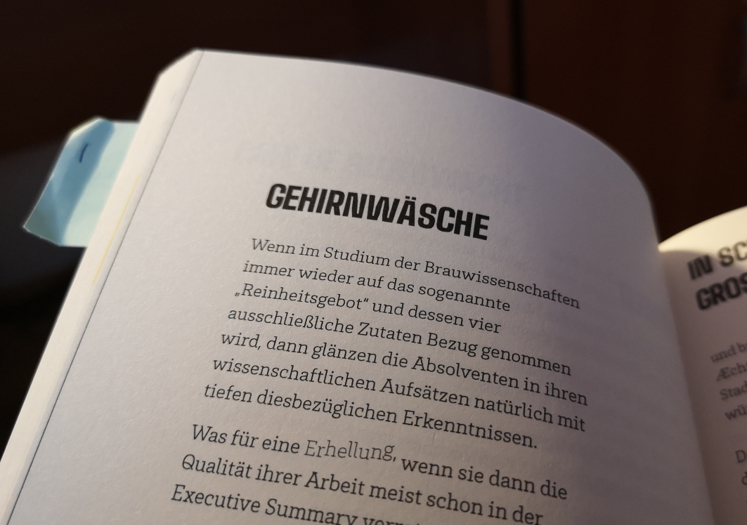 Ein Buch mit 366 Kapiteln, so dass man zu jedem Tag des Jahres (Schaltjahre eingeschlossen) einen neuen Text, ein Gedicht, einen Aphorismus, eine Parabel oder eine Persiflage zum Thema Bier findet.
