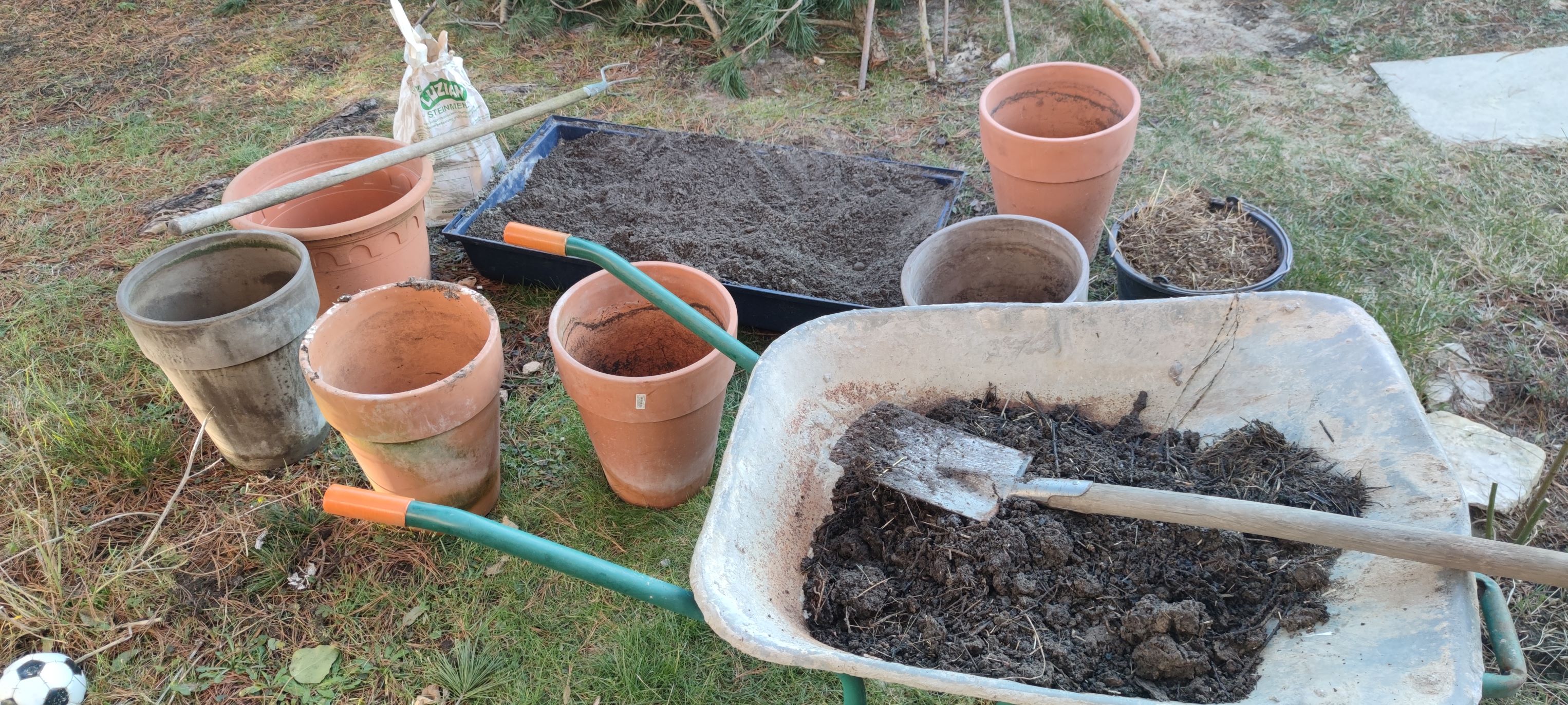 Als Zutaten habe ich Pflanzenerde vom letzten Jahr, Urgesteinsmehl, etwas Sand, in der Schubkarre frischen Kompost aus dem Garten (der noch von gröberen Ästchen befreit wird) und im schwarzen Eimer Kaninchenköttel. Die überwintern im Gewächshaus, bevor sie im Frühjahr in den Garten kommen. Jetzt im Frühjahr buddeln sie Gänge im Gewächshaus. Alles schön umgegraben und gedüngt, wenn die Tomatenpflanzen hineinkommen.