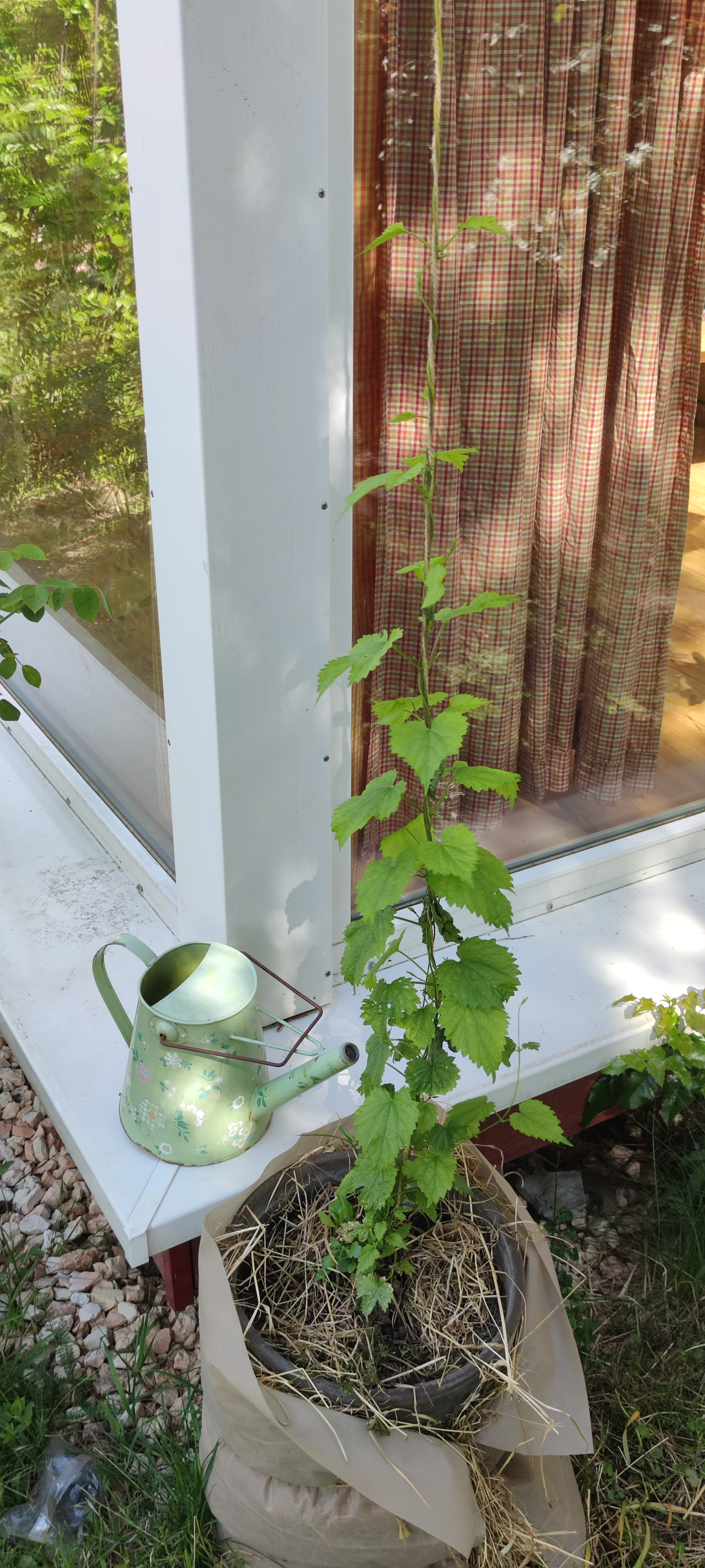 Mein Hallertauer Tango darf jetzt erstmal ein Jahr in einem größeren Topf bleiben, bevor er dann richtig eingepflanzt wird. Ansonsten wäre mir die Pflanze so spät im Jahr zu überwuchert. Er ist mit vier Trieben angekommen, ich denke ich lass es erstmal so.