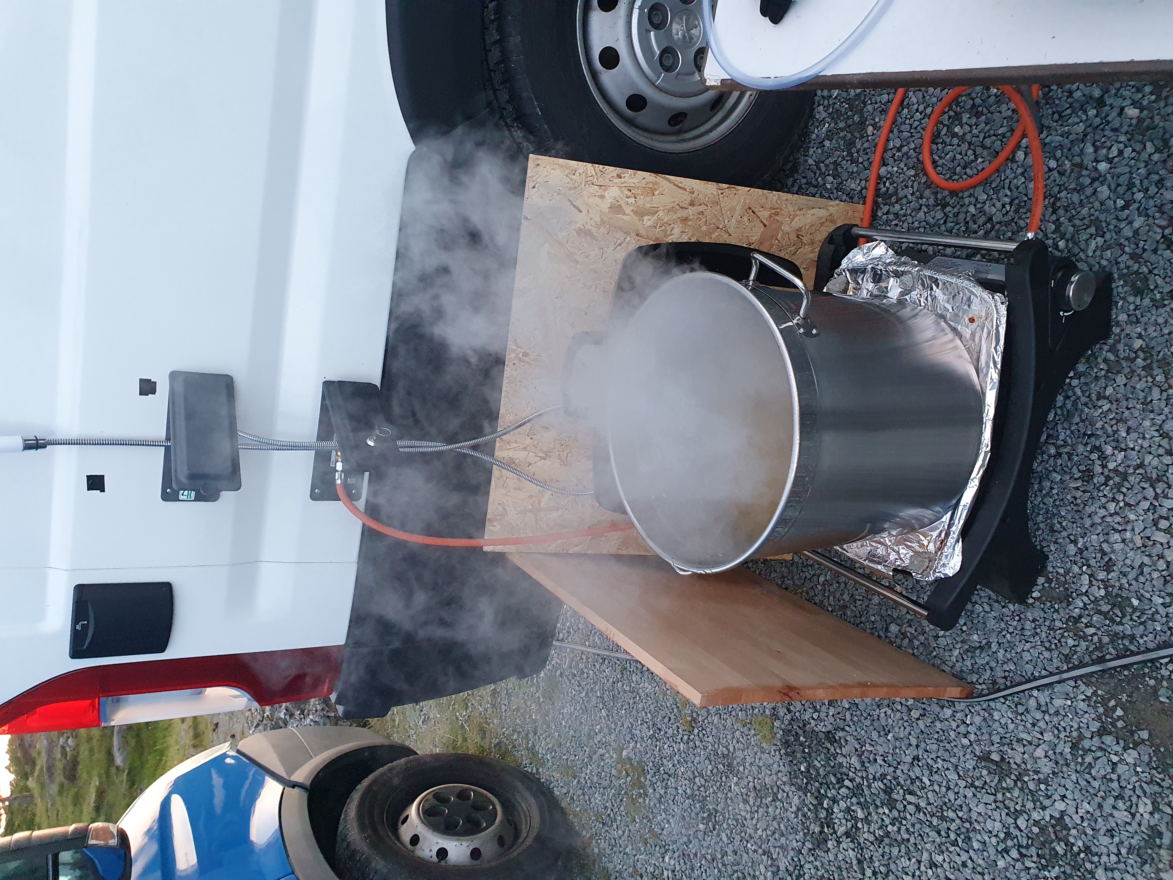 Mitgenommen wurden (siehe Fotos) ein Edelstahltopf (~40l?), ein Gährbehälter PET (~25l?), ein Brew-In-Bag-Sack, Oxireiniger, Gährröhrchen, Iod (nicht benutzt). Zutaten waren Gerstenmalz (irgendein milder Standard), Amarillo Hopfenpellets, Kveik LutraTrockenhefe. (Maisflocken waren dabei, aber nicht verwendet, hätten etwas viel Vorlaufzeit gekostet.)