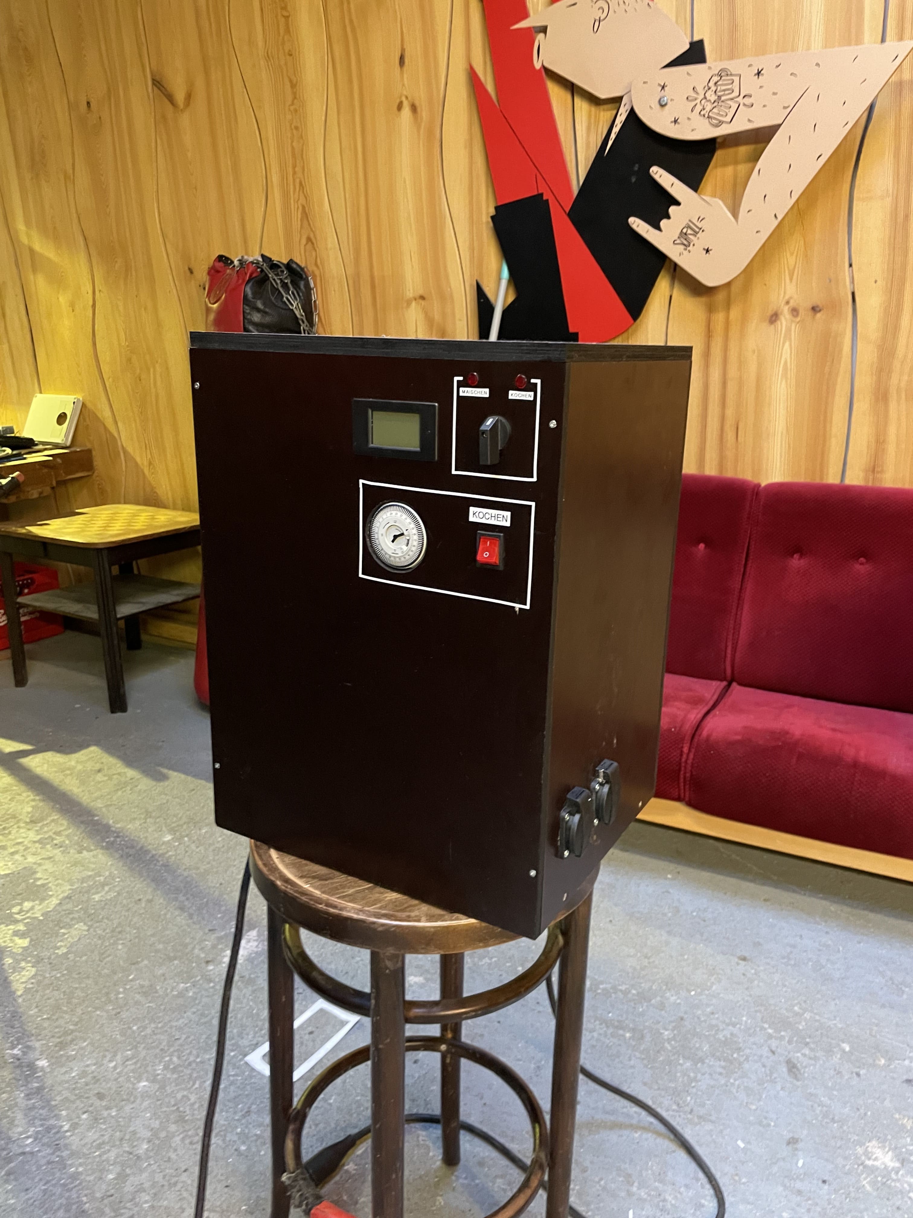 Im Brauraum/Getränkelager selbst steht bereits mein Kühl/Gärschrank, welcher mit einer selbstgebauten AiO Steuerung geregelt wird: Vorstellung AiO Gärsteuerung