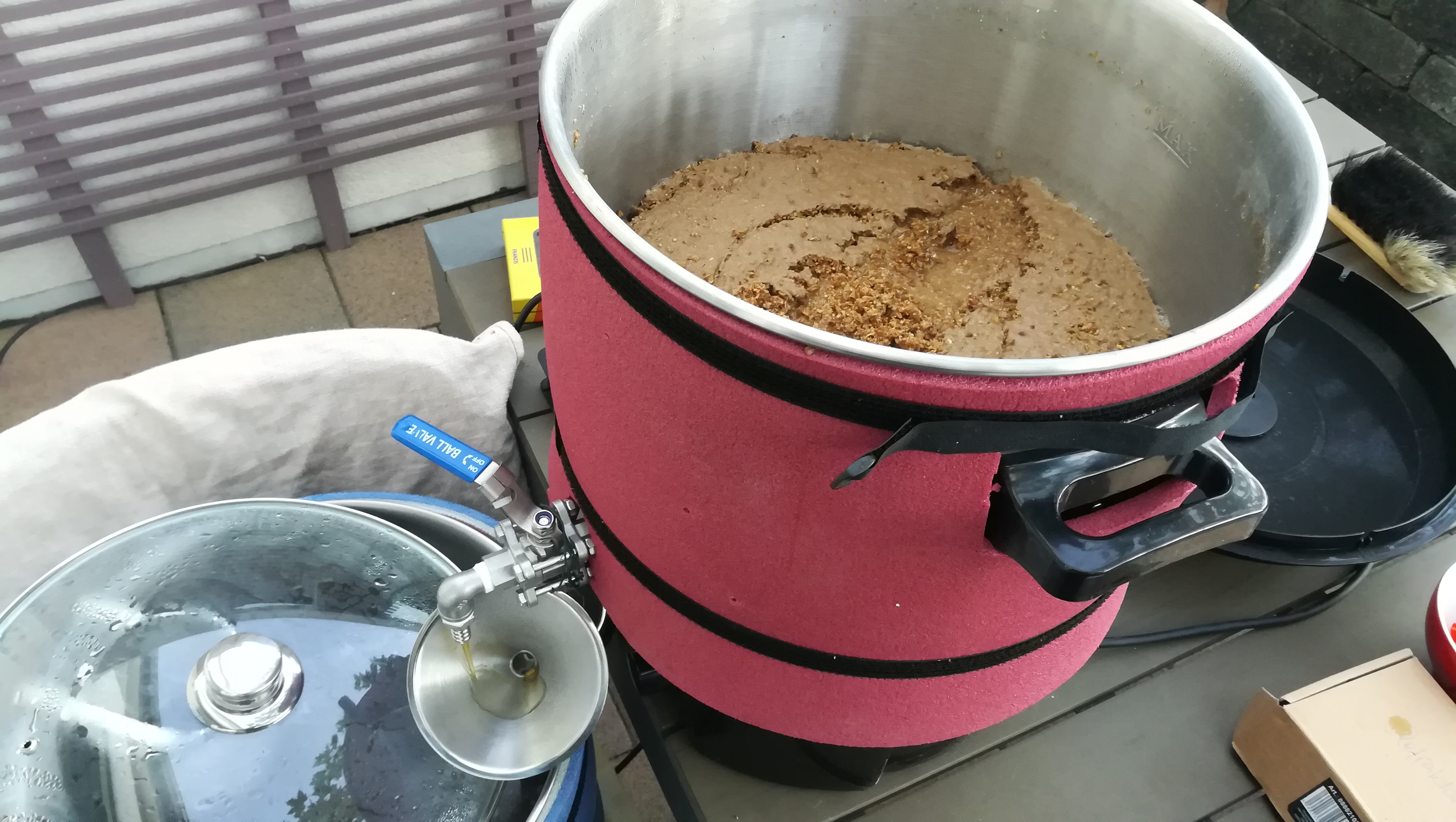 - Das Einmaischen der 2. Hälfte der Schüttung habe ich nicht fotografiert. Hier ist nun das Maischen beendet, die Trübwürze wird abgelassen und wieder draufgegeben. Die Jodprobe war in Ordnung.