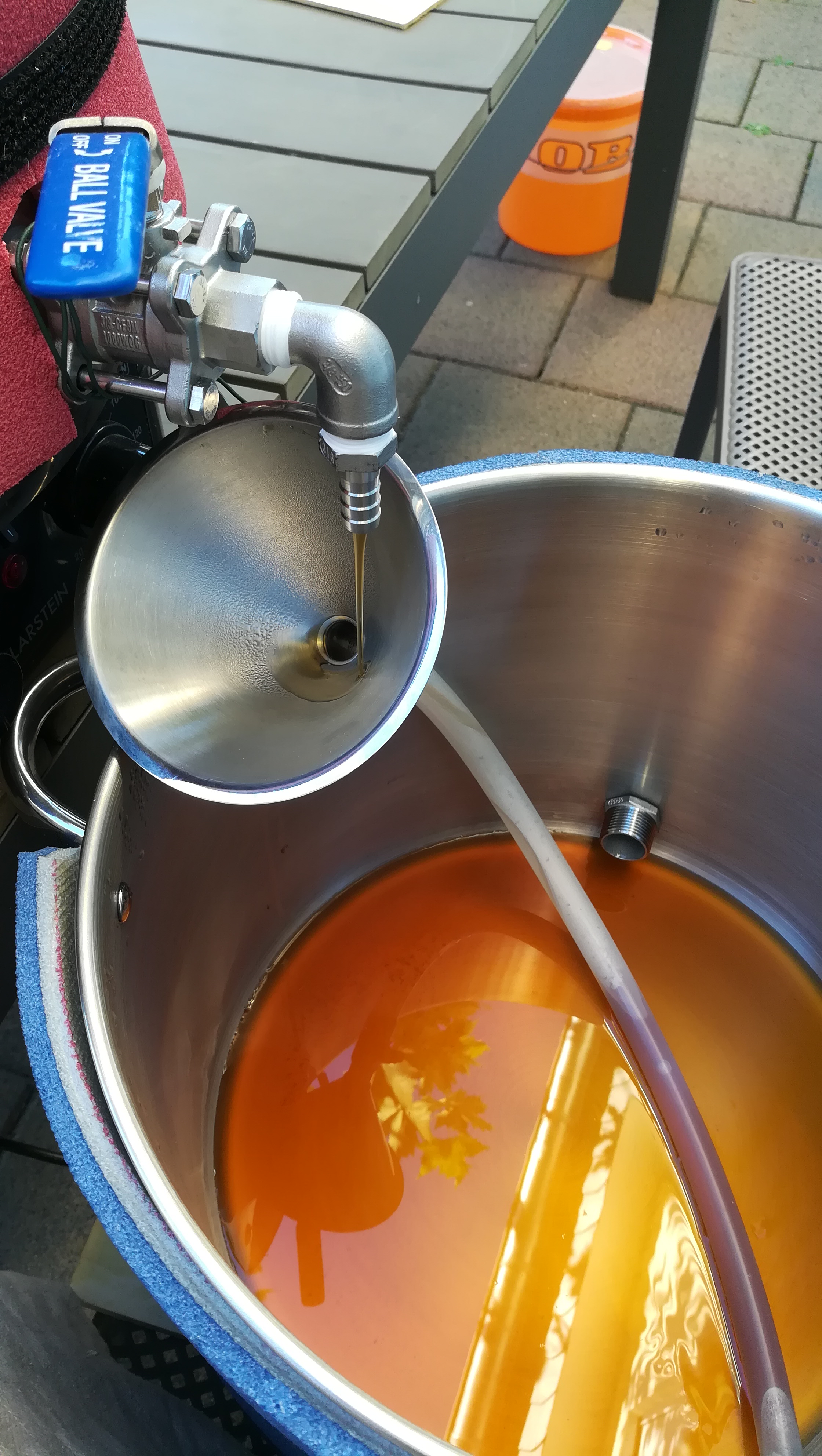 - Runterkühlen der Würze. Die neuen Gardena-Anschlüsse sind etwas schwer und ziehen die Kühlspirale zur Seite. Daher wird sie aufgehängt. Tipp meines Gehilfen!