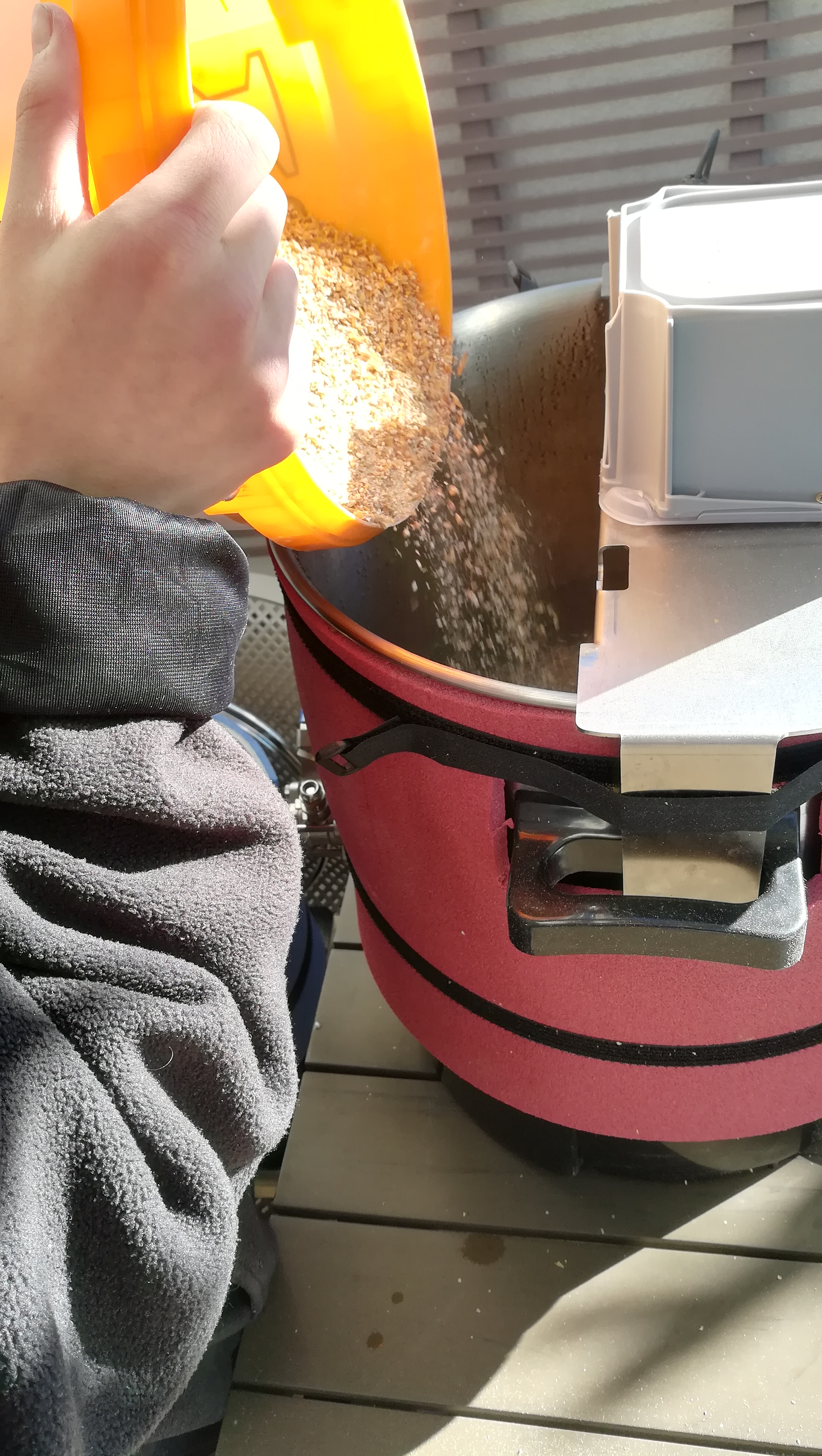 - Die erste Hälfte der Schüttung wird eingemaischt. Die geschredderten Maronen werden mit eingemaischt.