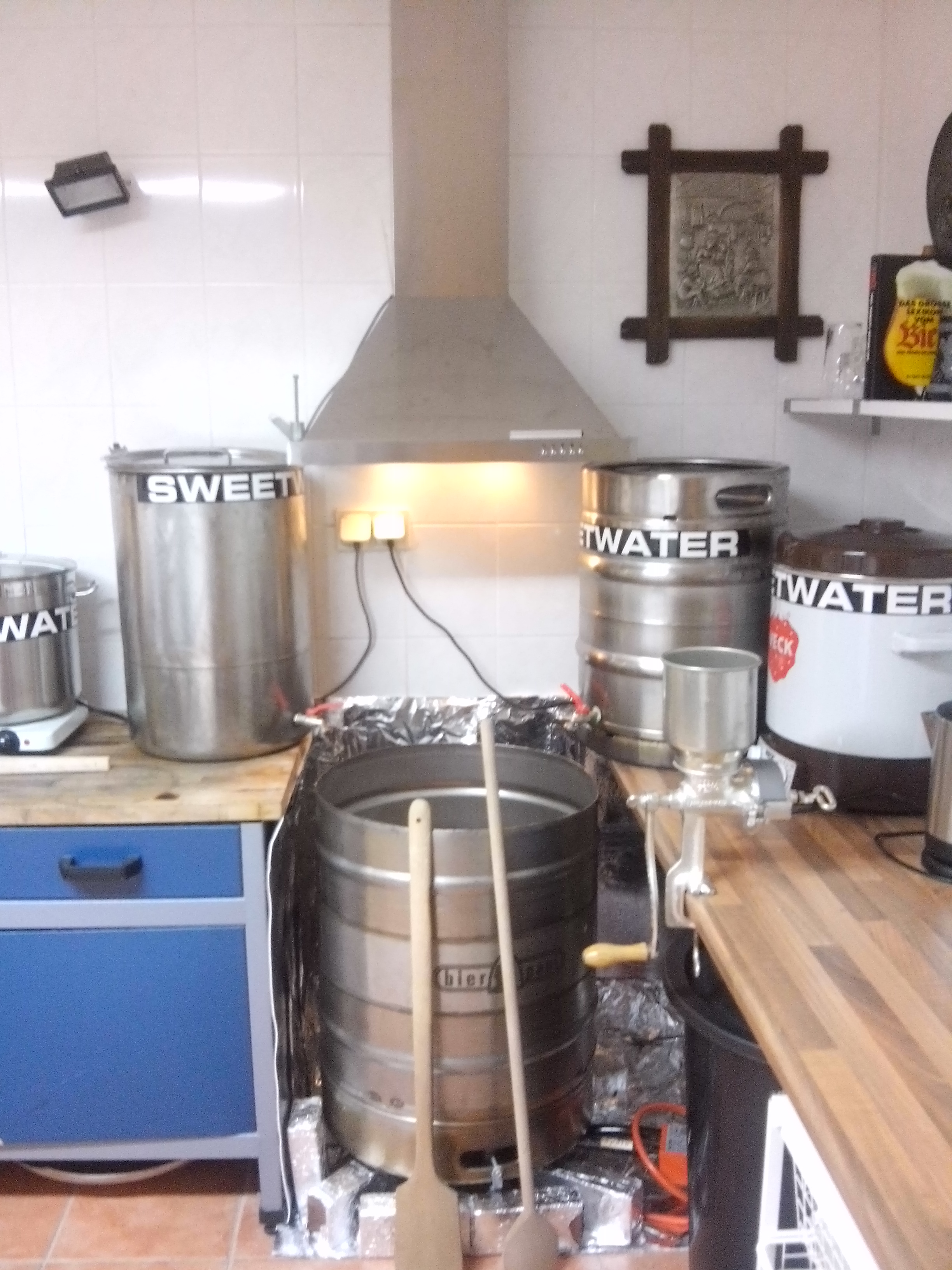 Während der Kessel beheizt wird führe ich die heißen Abgase mittels Alufolien an der Kegaussenwand entlang. Dieser einfache Trick wirkt zwar etwas primitiv aber ist überraschend effektiv ! Weitere Vorteil dieser Maßnahme ist eine deutlich geringerer Temperaturanstieg im Sudhaus während der Kochung Am kommenden Sonntag möchte ich den ersten Sud mit der neuen Anlage brauen. Besonders das Schroten von Hand wird bestimmt lustig
