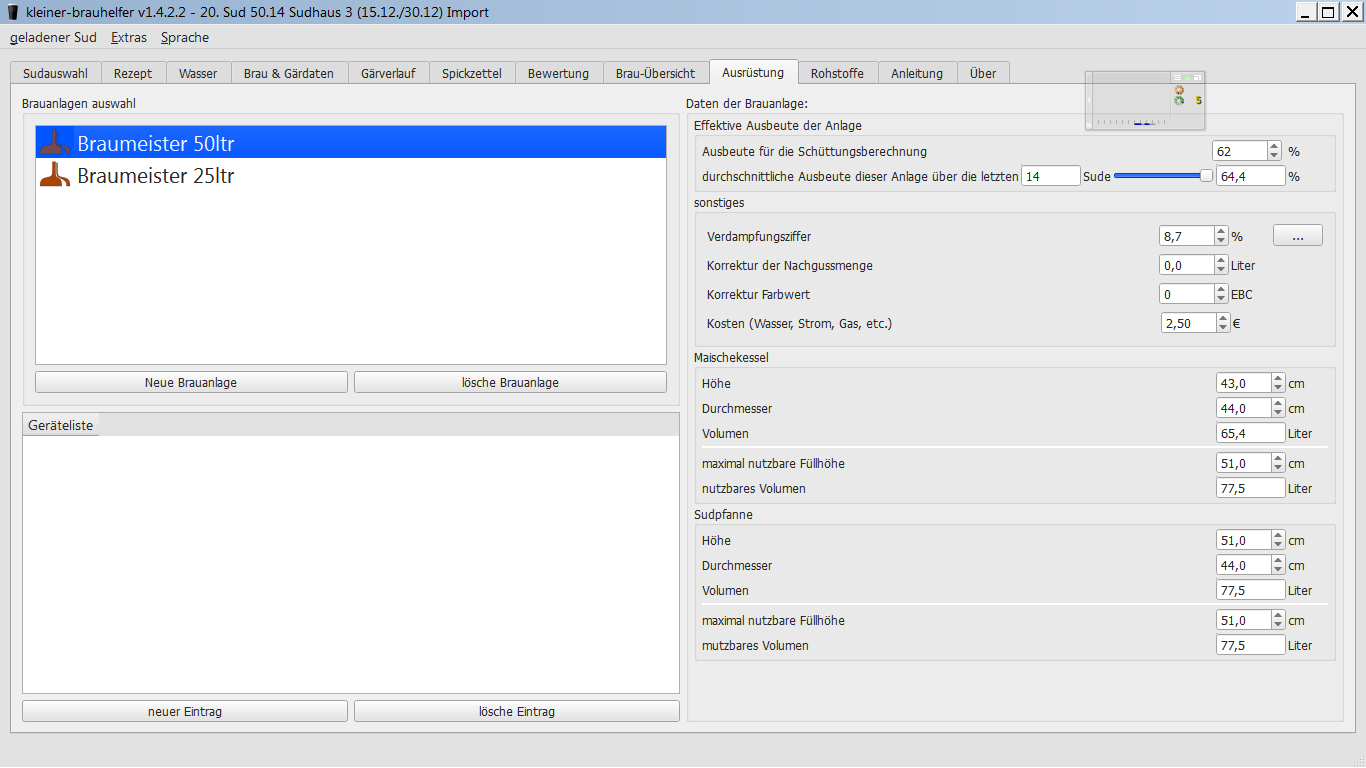 hier noch meine aktuellen Einstellungen der Ausrüstung BM 20 im Kleinen Brauhelfer: