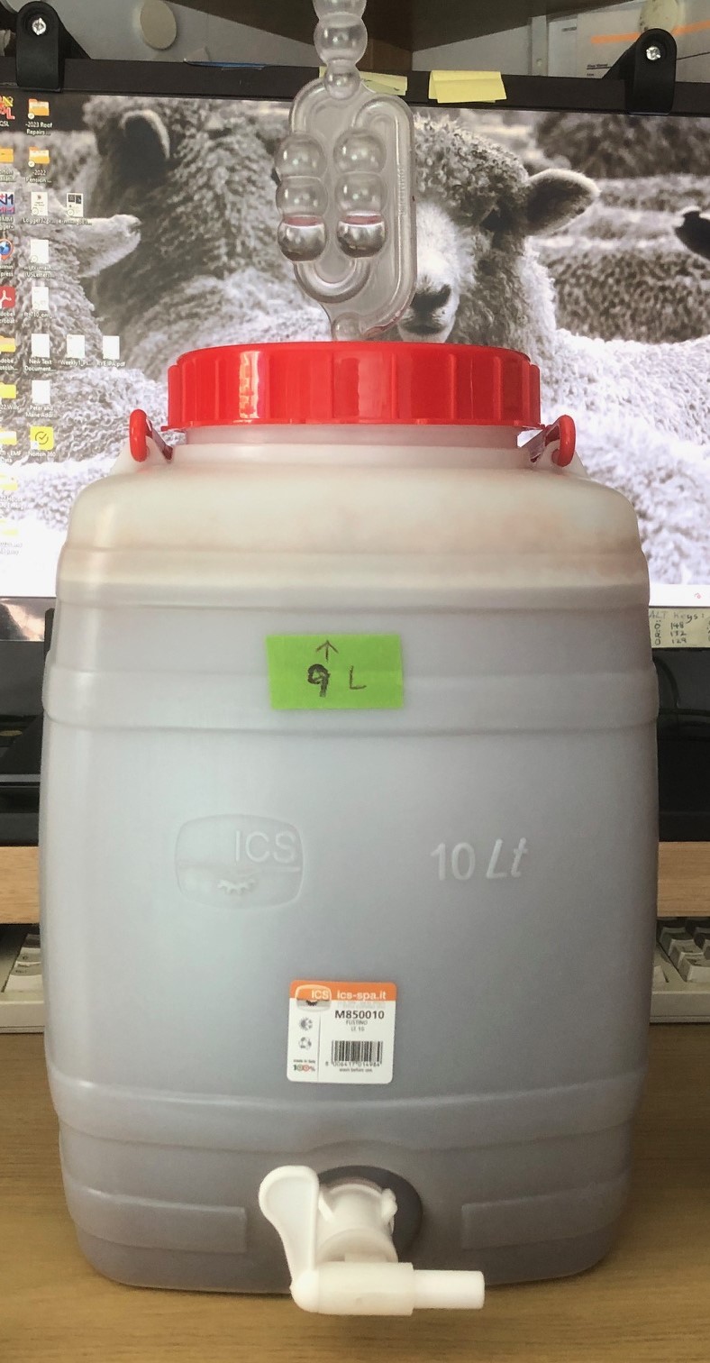 OK, heute mache ich hauptsaechlich kleine Mengen, 10 bis 20 Flaschen, was mir erlaubt ein wenig zu experimentieren - Saison im Moment. Zur Zeit habe ich gerade ein halbes Kit (750g Fluessigextrakt) von Wilko (First Gold IPA) gaeren im Plastikdemijohn, fuer 10 Liter, mit 500g Zucker, Lille Saison Hefe und Target Hopfen (dry hopping), Anfangs Gravity 1.048.