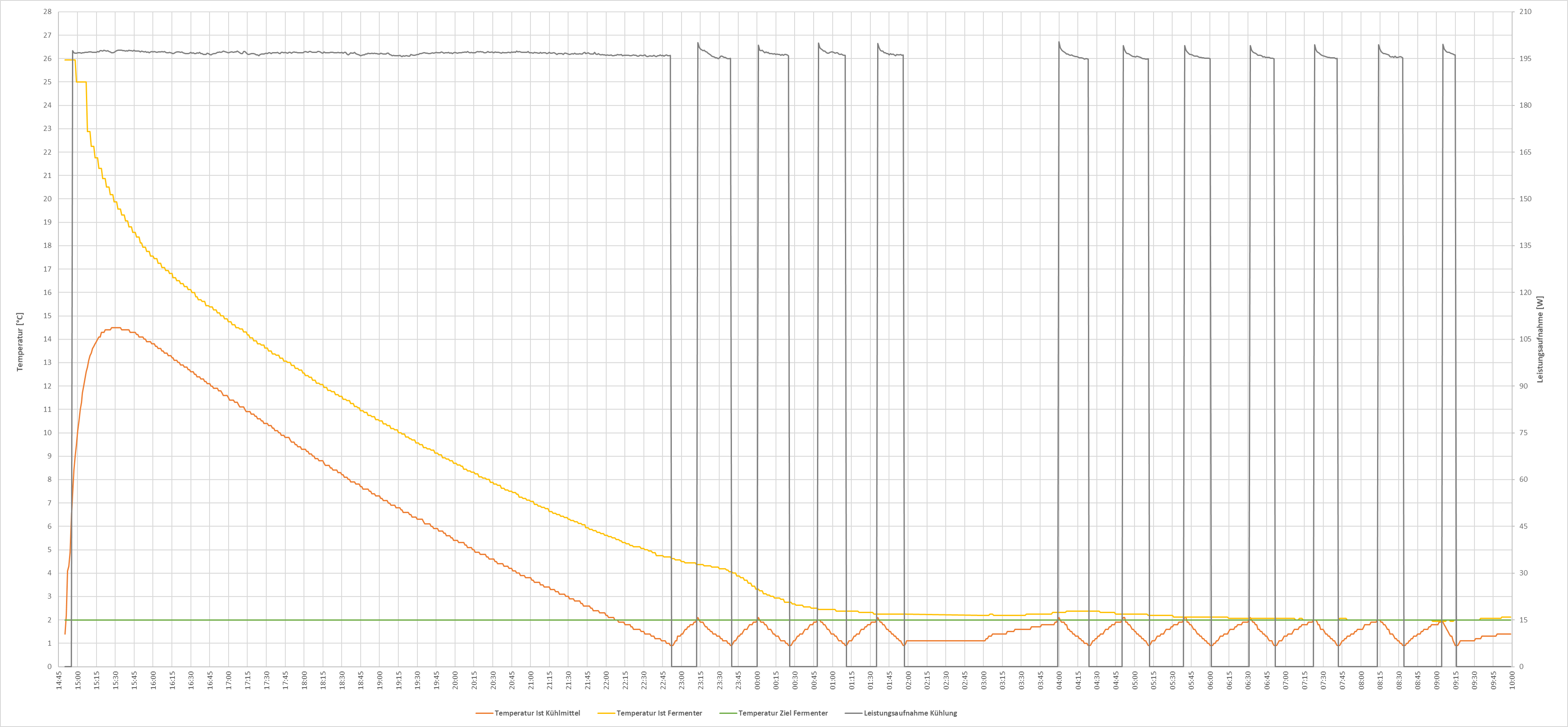 Also erstmal das Setup in den Keller verfrachtet, 25 Liter Wasser in meinen Fermzilla gefüllt, das Kühlmedium auf 1 °C runterkühlen lassen und den Testlauf gestartet. Einziger Haken am aktuellen Test: Der Keller hat momentan nur ca. 13 °C Raumtemperatur - ein etwas "unfairer" Vorteil für die Kühlung. Der Test muss an wärmeren Tagen definitiv wiederholt werden! Nachfolgende Grafik zeigt die 1) die Kühlmitteltemperatur, 2) die Wassertemperatur im Fermzilla (gemessen via iSpindel), 3) die Leistungsaufnahme und die 4) Ziel-Temperatur für den Fermzilla: Fazit: 2 Grad sind, zumindest unter den aktuellen (suboptimalen) Bedingungen, kein Problem! Vorsichtige Freude: Damit ist die Leistung schon mal identisch zu meinem Kühlschrank, denn der schafft nicht weniger als 3 °C.