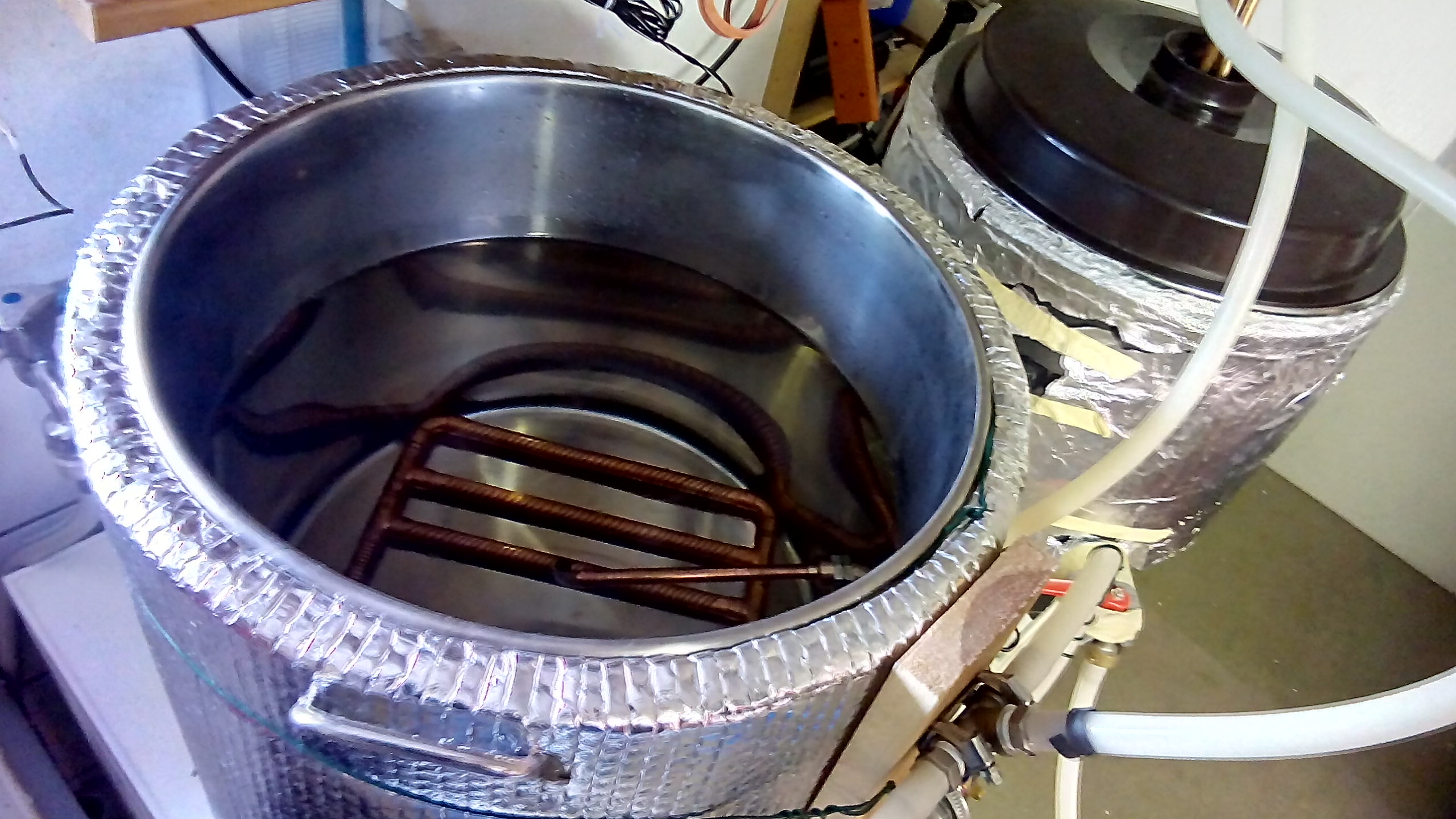 Hier schonmal die Teile aus Kupferrohr. Hinten das Läutersystem, rechts der Wärmetauscher aus 12er Cu Rohr. Ich habe 5 Meter genommen und einfach über ein CC Keg gezogen, oben mit Winkel und 1/2" Anschluss versehen. Die unterste Windung hat vier kleine Wicklungen aus Küchengarn, damit das Kupfer nicht auf dem Boden des Einkochers rumscheuert.