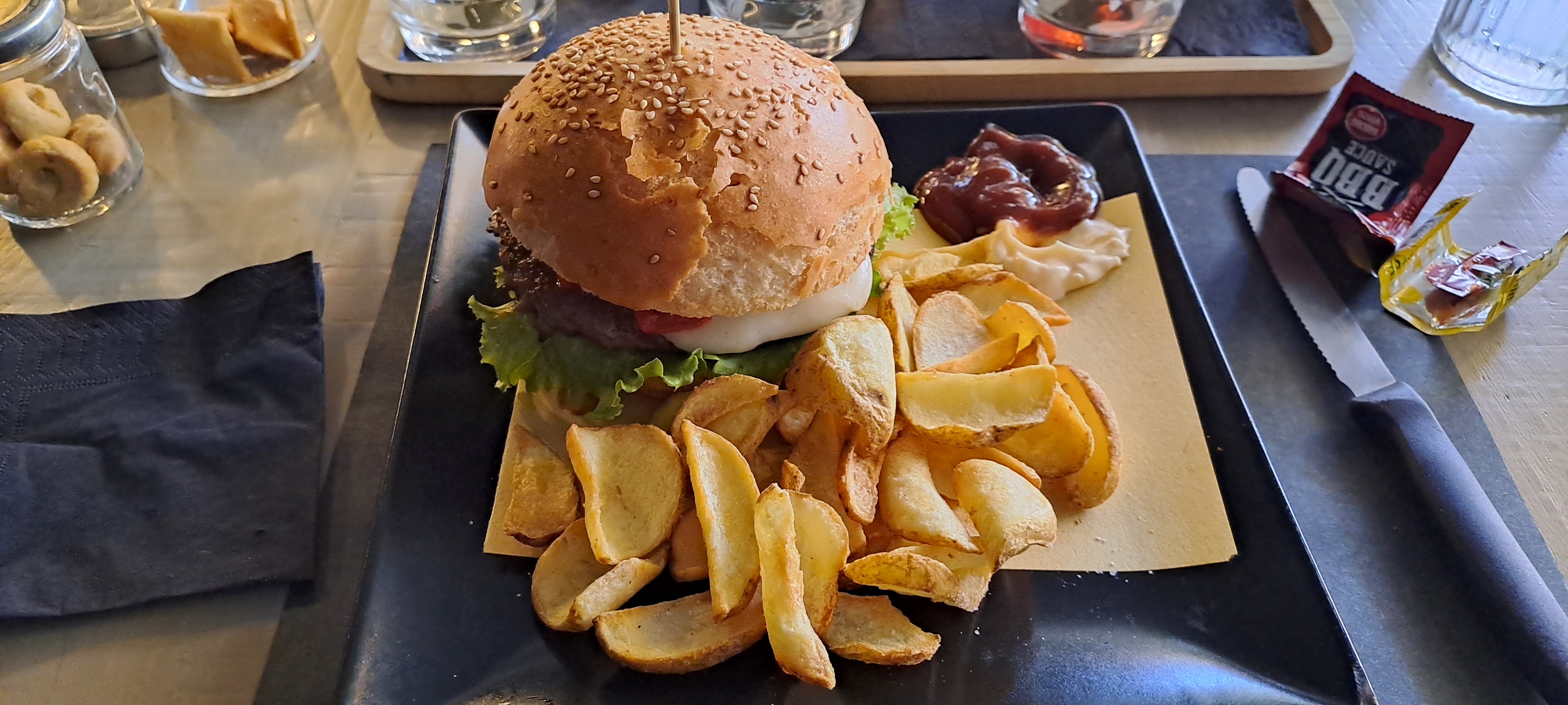 Zum Essen: Ich hatte den sehr leckeren Hamburger mit ebenfalls sehr guten und handgemachten Pommes.