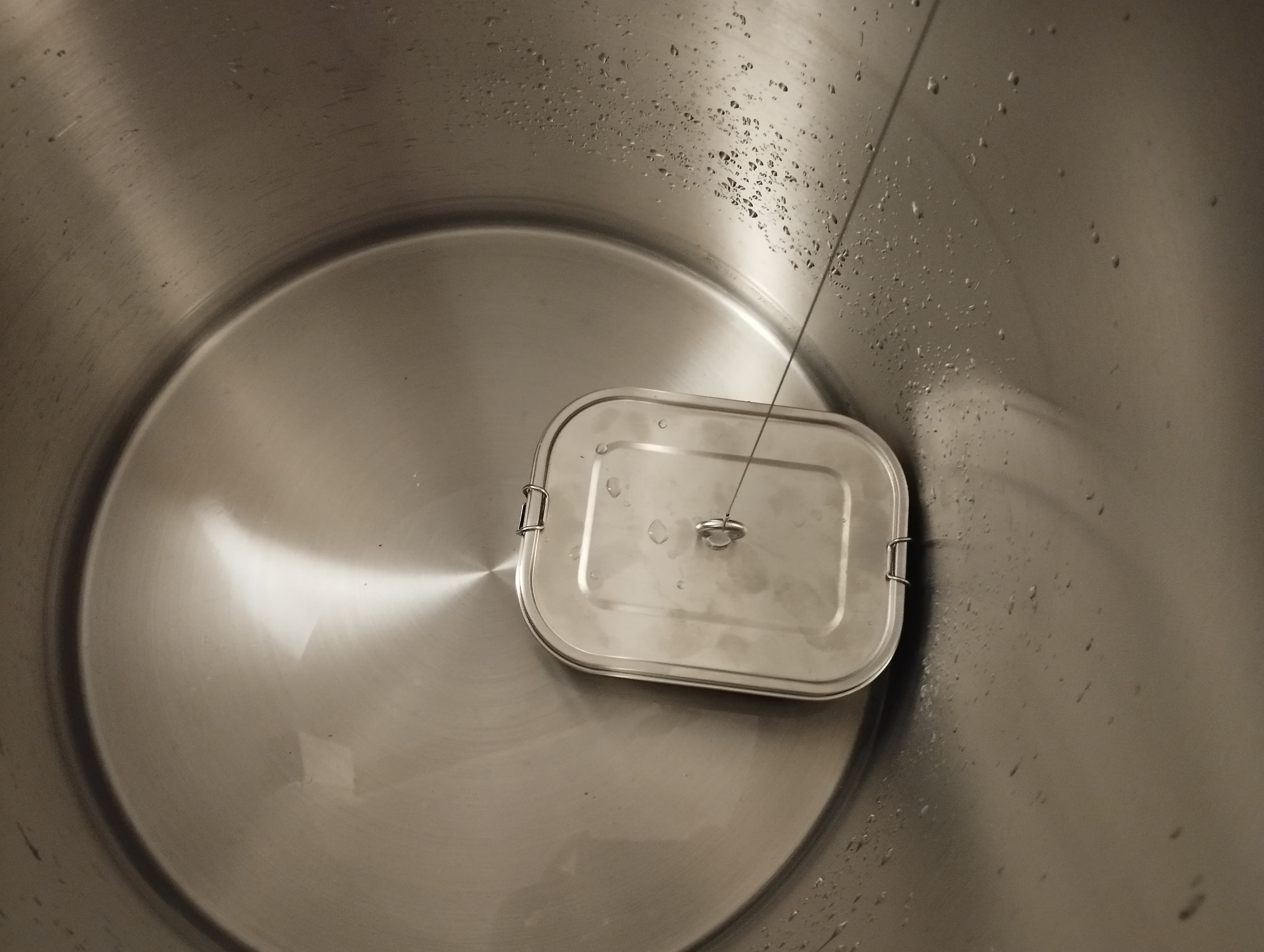 1. Eine Brotdose aus Edelstahl als Schwimmer + Gewicht