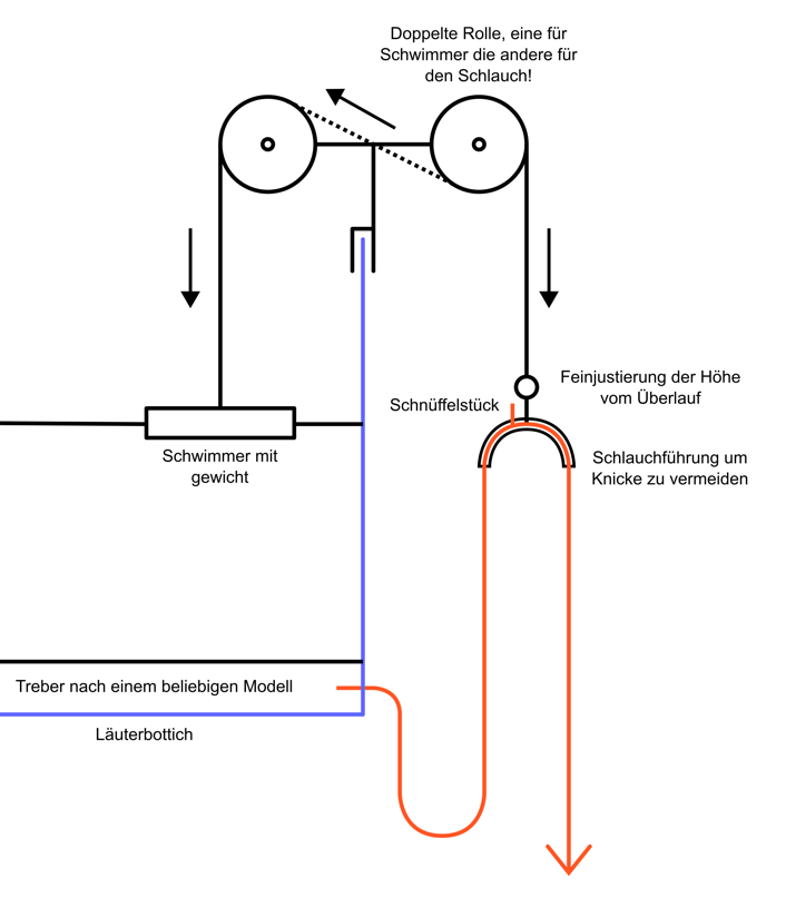 Ich glaube aber auch nicht dass es in der Praxis gut funktioniert. Was passiert wenn der Schwimmer auf dem Treber aufsetzt? Das Würzelevel sinkt ja tiefer als der Treber und sobald die Nachgüsse starten ist die Würze eh recht konstant auf Treberhöhe. Und kann der Schwimmer überhaupt das Gewicht vom Schlauch tragen?