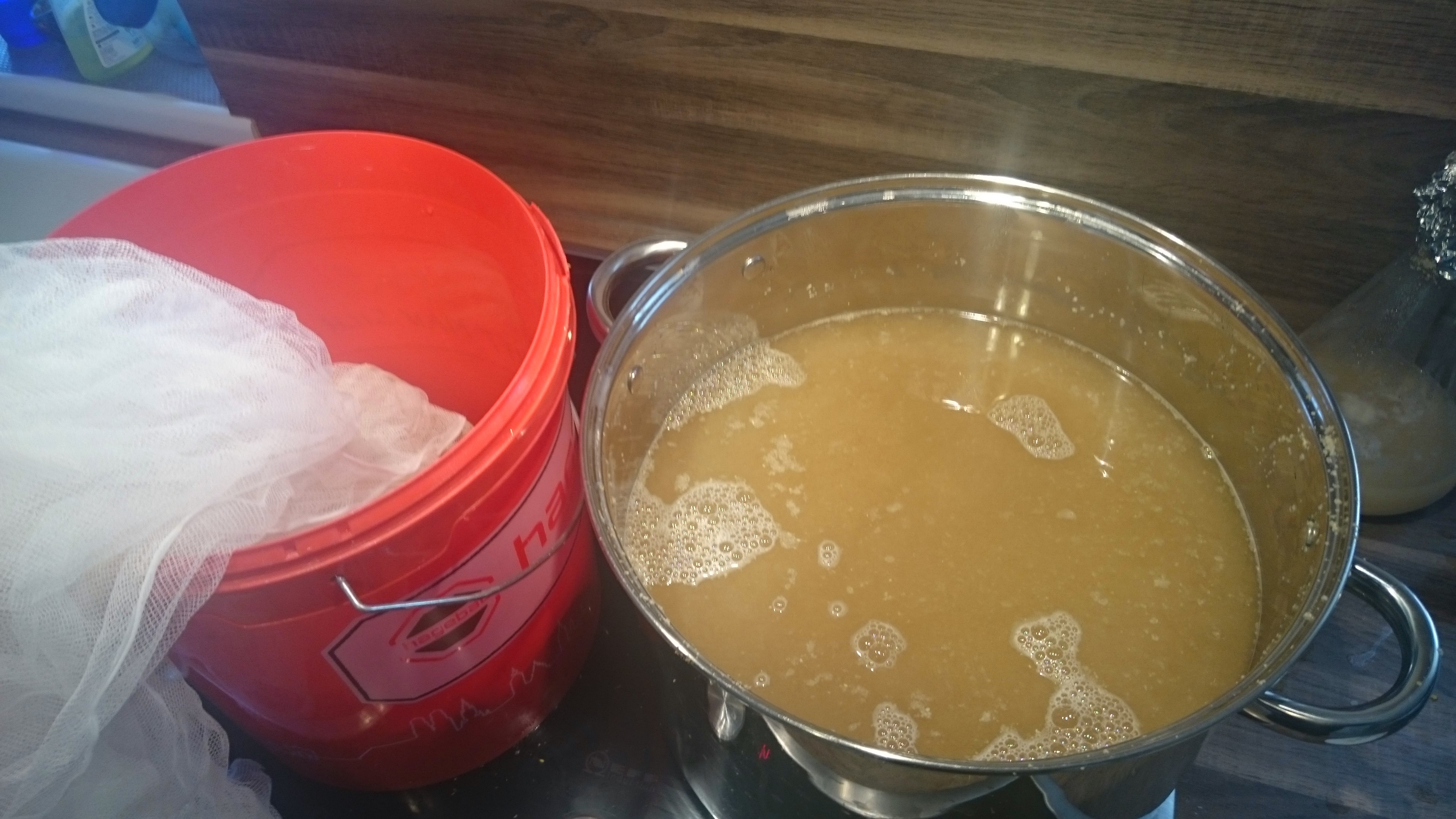 Die grosse Anlage blieb heute kalt - ich wollte zum ersten Mal BIAB ausprobieren (bzw BITCH). Dementsprechend wurde im Vorhang eingemaischt - Kombirast @ 67°C für eine Stunde, danach schnell Jodprobe (in Ordnung) und rauf auf 78°C. Bei BITCH ist Läutern nicht vorgesehen - Vorhang raus, abtropfen lassen und die Würze bleibt zurück im Topf. Allerdings ziemlich trüb, aber das war ja erwartet. Übrig blieb ungefähr 8,5l bei 8,5 Brix.