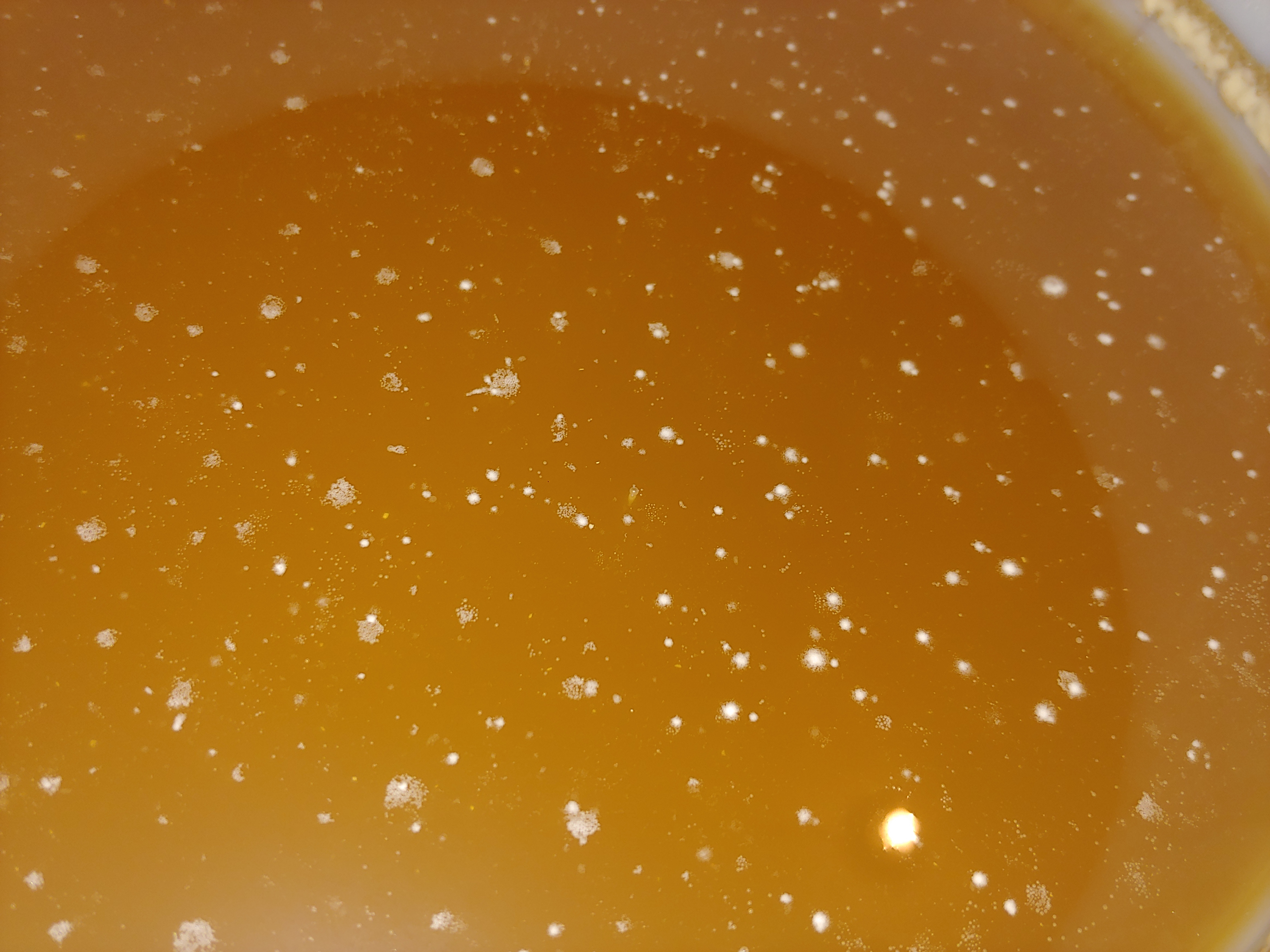 So sieht es im Gärbottich nach der Gärung aus. Das auf der Oberfläche sind noch einzelne Hefeinseln und wie von Kurt bereits geschrieben, am Rand die Brandhefe. Fertig zum Abfüllen würde ich da sagen