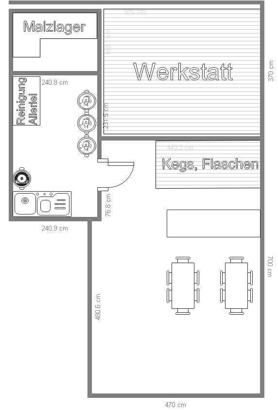 Über die Festtage hatte ich wieder ganz kurz Zeit, ein wenig mit den Gegenständen und Gedanken zu spielen, was etwa wo hin gehören könnte. Dank euren Tipps bin ich einmal auf folgende Ausführung gekommen. Beim Malzlager möchte ich einen Tisch über den Tonnen machen, wo dann auch die Malzmühle draufstehen würde. Räumlich getrennt und ganz weit weg von der Feuchtigkeit des Hopfenkochens und Reinigungsvorgangs.
