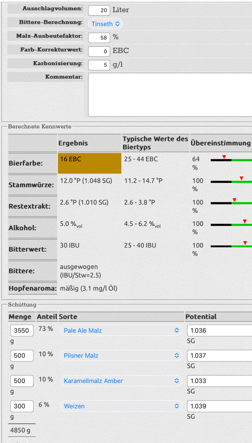 Also ich hab es jetzt mal auf die Schnelle durchgerechnet. Mit oben genannter Schüttung und Kombirast erziele ich ziemlich genau die Werte die von dir angegeben sind.