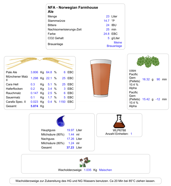 Ich hab heute auch gerade mit Wacholder gebraut. 50 g Wacholderbeeren für 28 l und zusätzlich durch Wacholderzweige geläutert.
