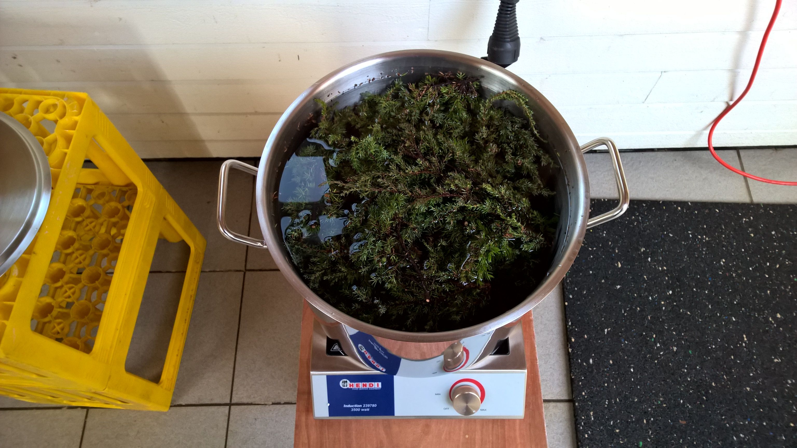 Heute ging es dann los mit dem Brauen. Zunächst wurde der Wacholder gewissenhaft gesäubert, eventuelles Hundepipi abgespült und dann bei 80°C-85°C ca 20 Minuten ziehen gelassen. Was soll ich sagen - zunächst roch es eher nach warmen Waldboden, vor Begeisterung umgefallen bin ich zunächst nicht.