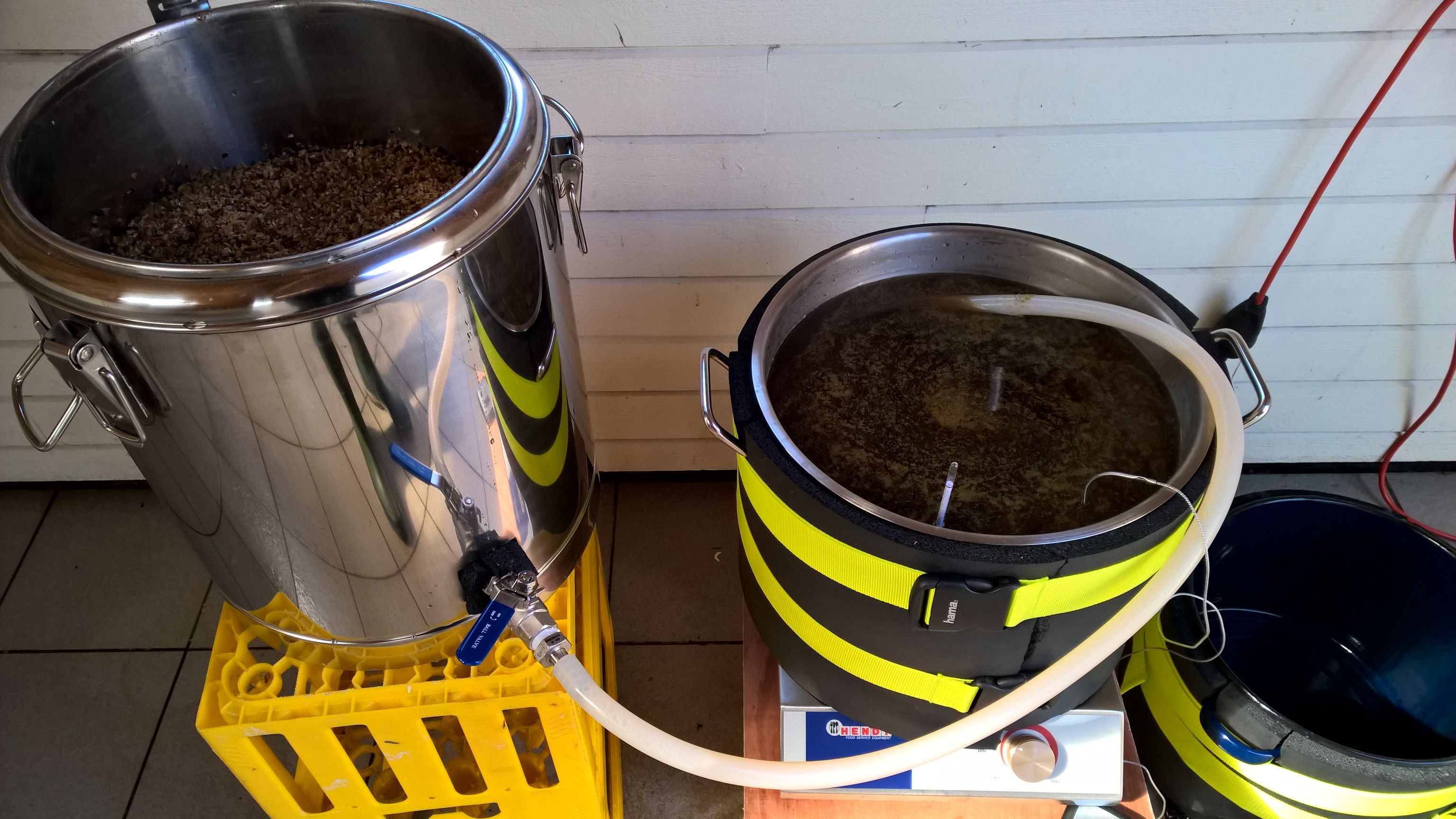 Vom Wacholdersud wurde der HG Anteil abgezwackt, der Rest ist für den NG.  Bei 73°C eingemaischt. Der 25L TP ist bis zum Anschlag voll, aber das muss noch rein. Gelandet bin ich bei 66°C
