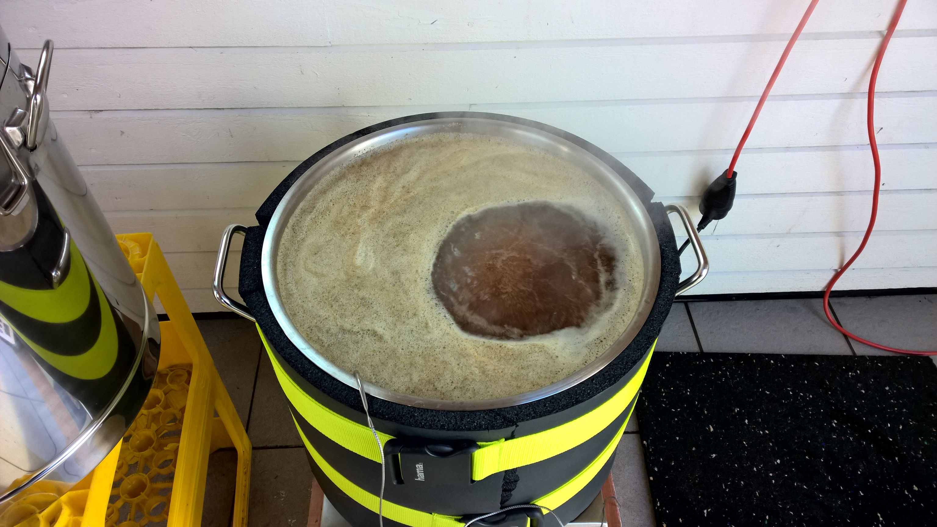 Ausgeschlagen habe ich etwa 22L mit 15°P. Evtl verdünne ich noch auf 14.5°P runter. Zum Abkühlen stelle ich meine kleine Gärkanne in die Badewanne. Bei 22°C habe ich den Bodensatz eines 1L Starters der WLP 6788 hinzugegeben. Die Gärung kam innerhalb von 4h an.